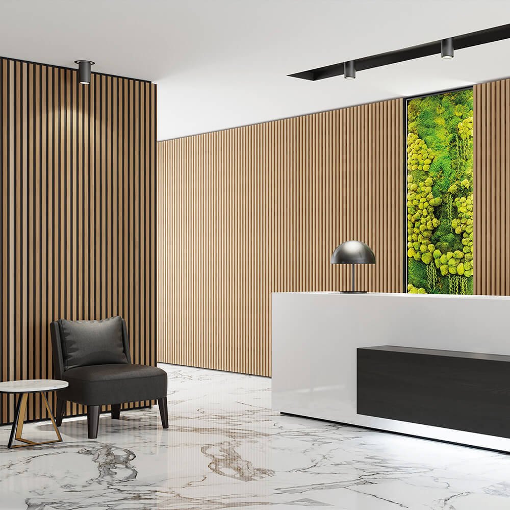 Die Lamellen sind aus MDF gefertigt und besitzen je nach Variante eine furnierte oder Dekor-folierte Oberfläche.