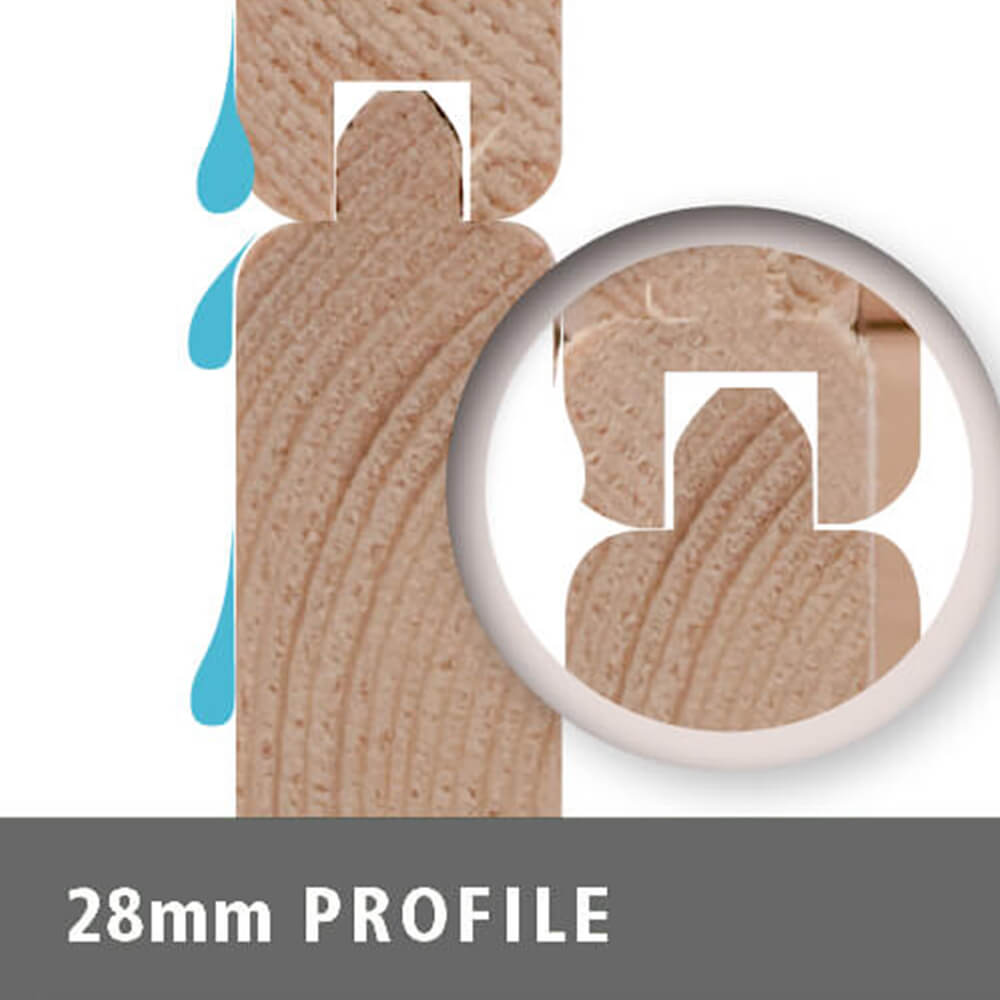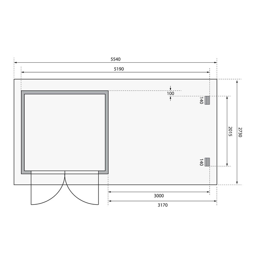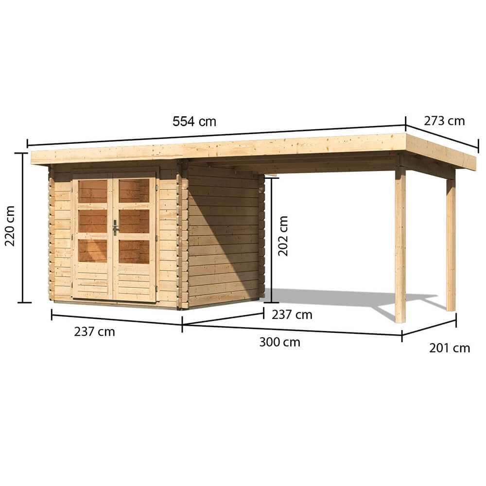 28 mm Wandstärke, Doppeltür, Blockbohlen-Bauweise, Firsthöhe 220 cm, mit seitlichem Anbaudach (300 cm) , Nadelholz naturbelassen.