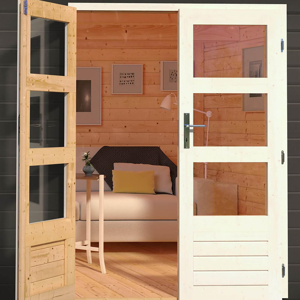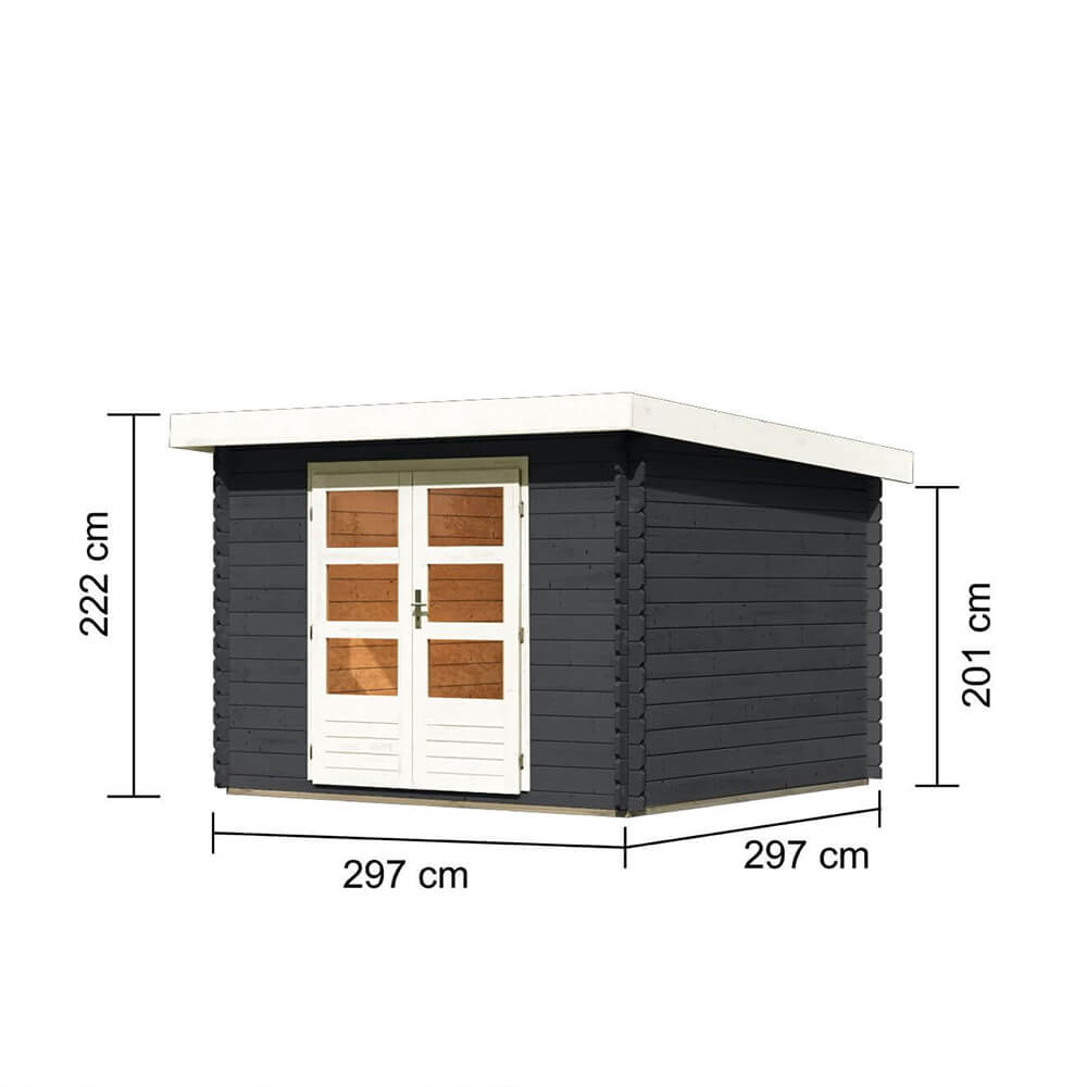 28 mm Wandstärke, Doppeltür, Blockbohlen-Bauweise, Firsthöhe 222 cm, Nadelholz farbig behandelt.