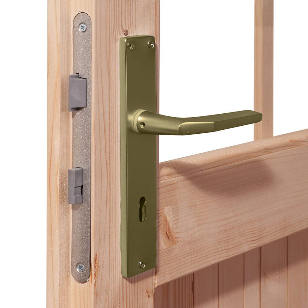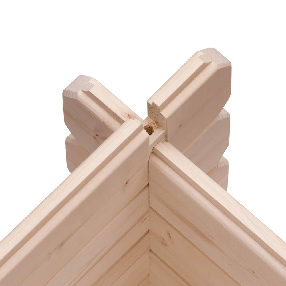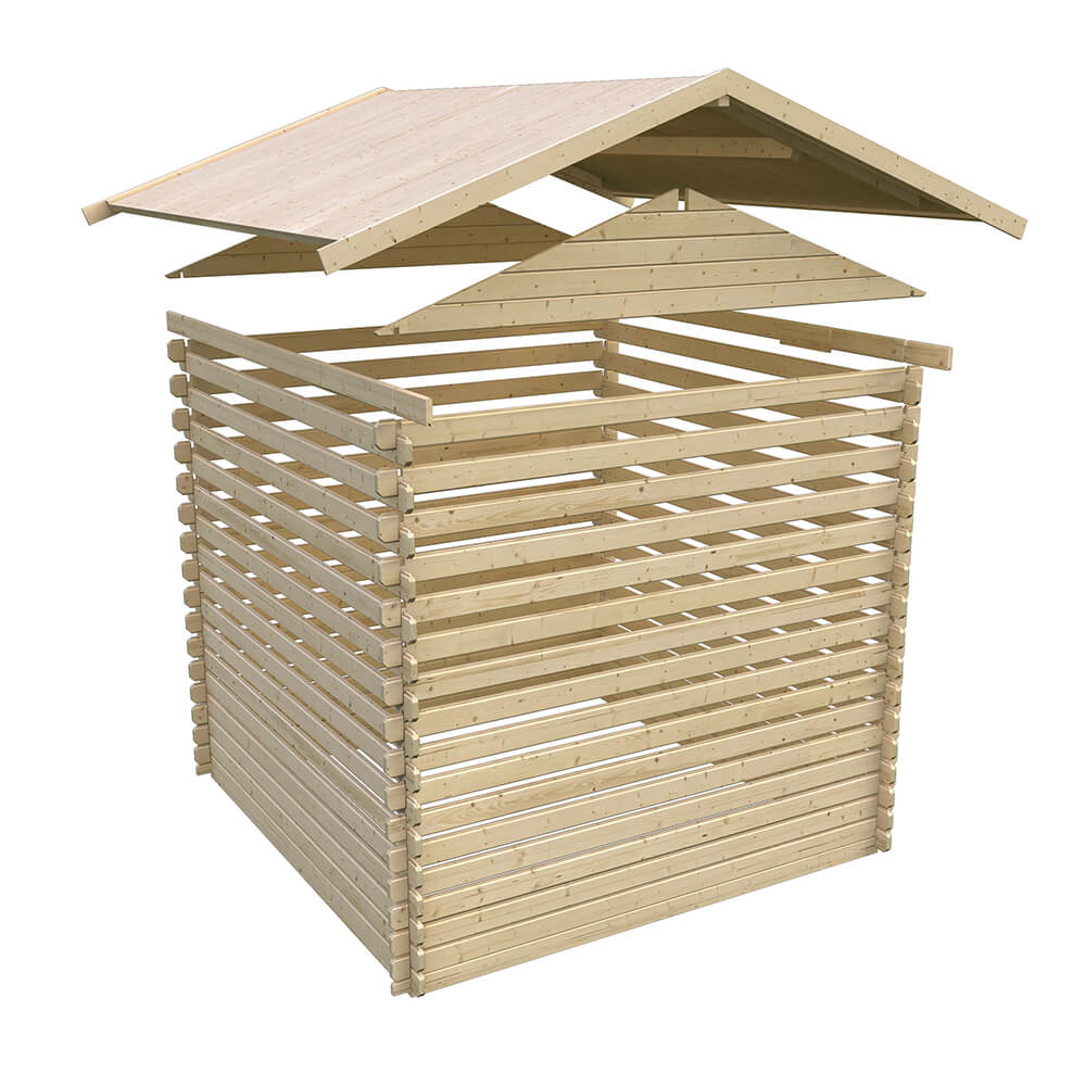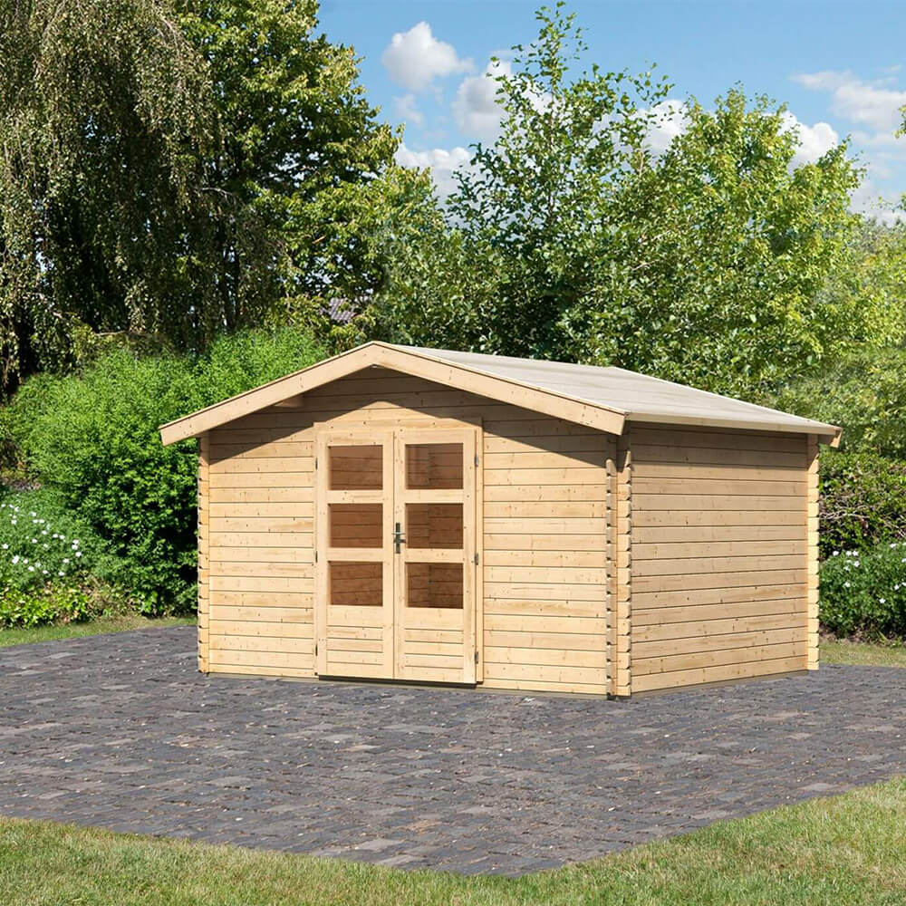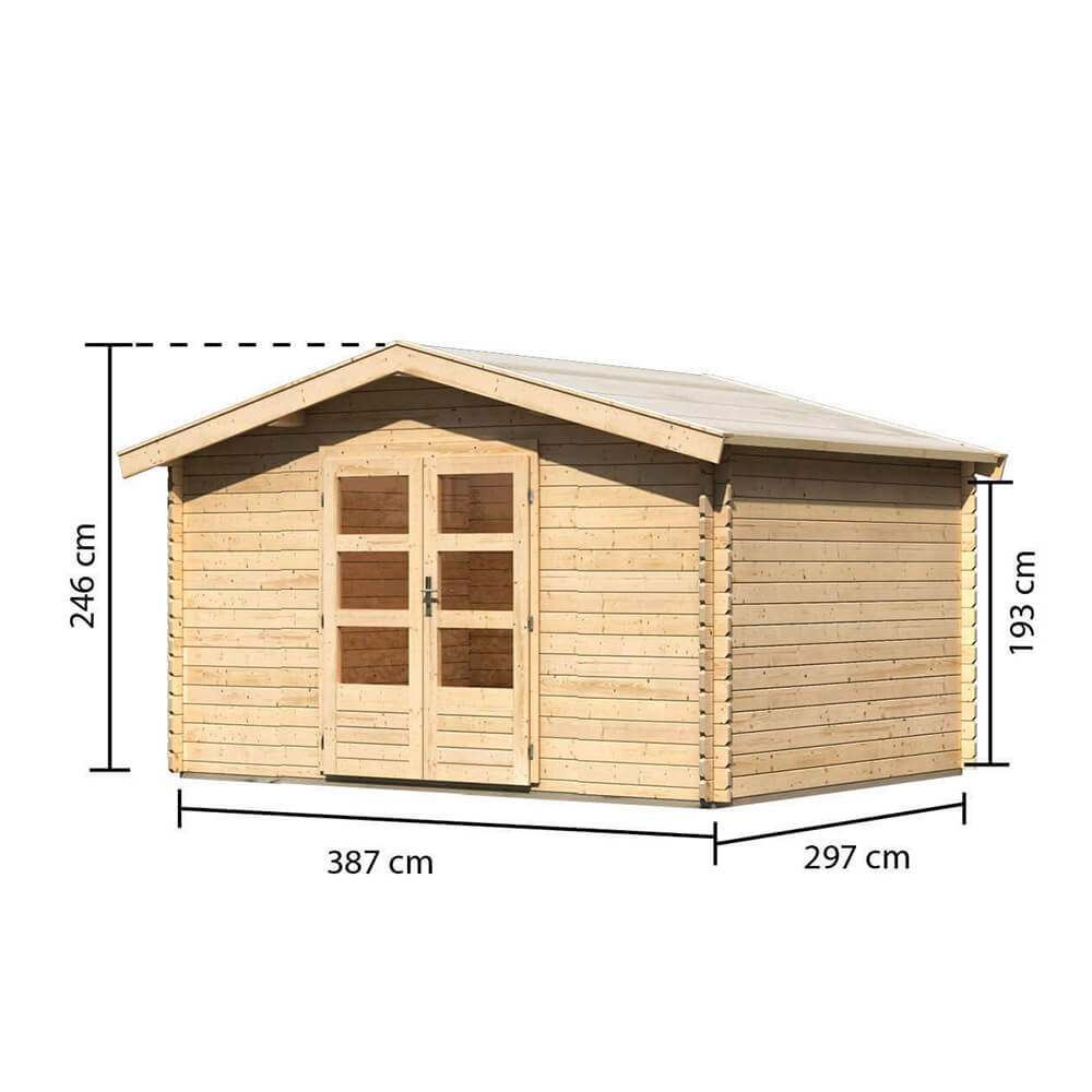 28 mm Wandstärke, Doppeltür, Blockbohlen-Bauweise, Firsthöhe 246 cm, Nadelholz naturbelassen.