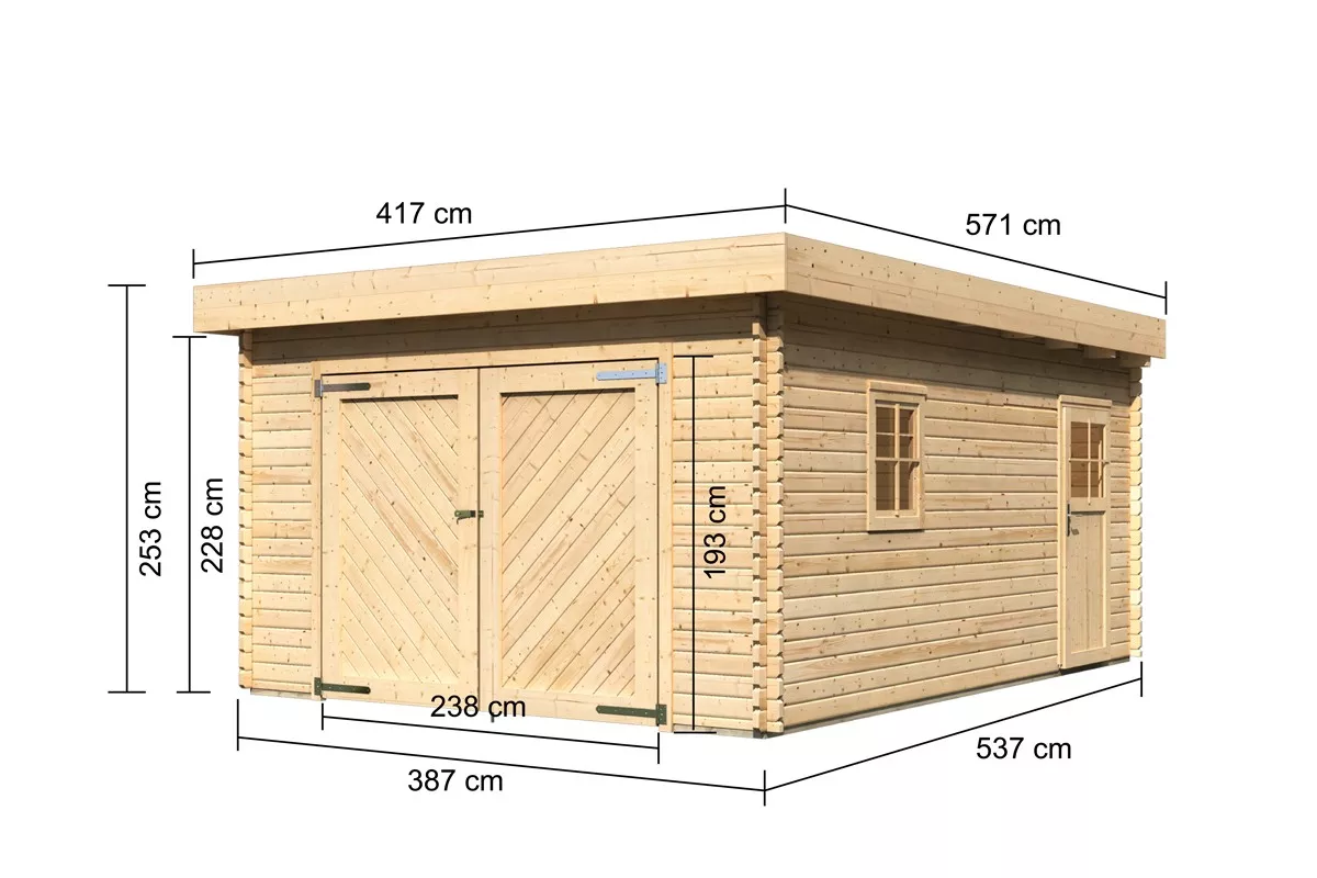 38 mm starke Wandkonstruktion, großzügiges Einfahrtstor, modernes Flachdach – diese Eigenschaften beschreiben die Blockbohlengarage mit Flachdach. Das Flachdach besteht aus Massivholzbretter und bietet, ausgekleidet mit unserer optional erhältlichen selbstklebenden Dachfolie (Bedarf: 6 Rollen), Ihrem Auto den idealen Schutz vor der Witterung. Montiert in der klassischen Blockbohlenbauweise, gewähren die 40mm Wandbohlen und die patentierte 6-Plus-Eckverbindung eine stabile Konstruktion. Das naturbelassene, nordische Fichtenholz kann frei nach Ihren Vorstellungen gestaltet werden. Schützen Sie das Holz mit einer klassischen Schutzlasur und behalten Sie die typische Holzfarbe bei oder streichen Sie es zusätzlich in Ihrer Lieblingsfarbe. So können Sie die Blockbohlengarage ganz einfach nach Ihrem Geschmack und der Umgebung gestalten. In das Innere gelangen Sie über ein Vollholzgaragentor in der Front mit einem Durchfahrtsmaß von 240x193cm, sowie Profilbeschlägen und einer Sicherheitsüberfalle oder über eine Einflügeltür in der Seite mit einem Lichtausschnitt und einem Buntbartschloss inkl. zwei Schlüsseln. Diese gewährleisten einen idealen Schutz vor unbefugtem Betreten und Entwenden Ihres Eigentums. Durch ein im Lieferumfang enthaltenes, frei positionierbares Dreh-/Kippfenster gelangt genügend Tageslicht in den Innenraum und schafft so eine natürliche Lichtquelle. Runden Sie das Gesamtbild der Garage mit einem Außenmaß von 387 x 537 cm durch eine optional erhältliche Holzdachrinne ab. Schaffen Sie einen modernen, geschützten und trockenen Ort für Ihr Eigentum mit der Blockbohlengarage mit Flachdach.