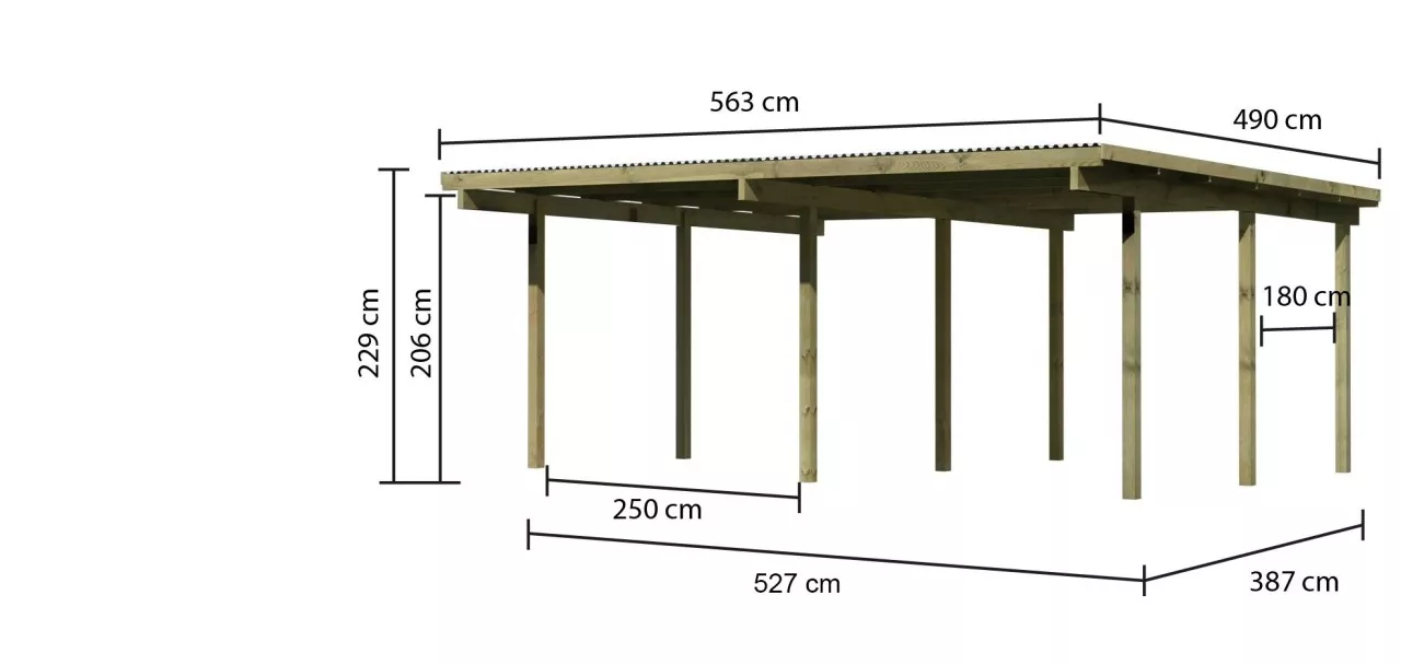 Mit einem Außenmaß von (BxTxH) 509x387x229 cm bietet dieses genügend Platz. Eine Stellfläche hat die Breite von 250 cm und hat bestimmt auch für Ihr Auto ausreichend Platz. Gestalten Sie die Optik Ihres Doppelcarports mit einem oder zwei Einfahrtsbögen. So ist auch das Einparken von der Seite kein Problem mehr.