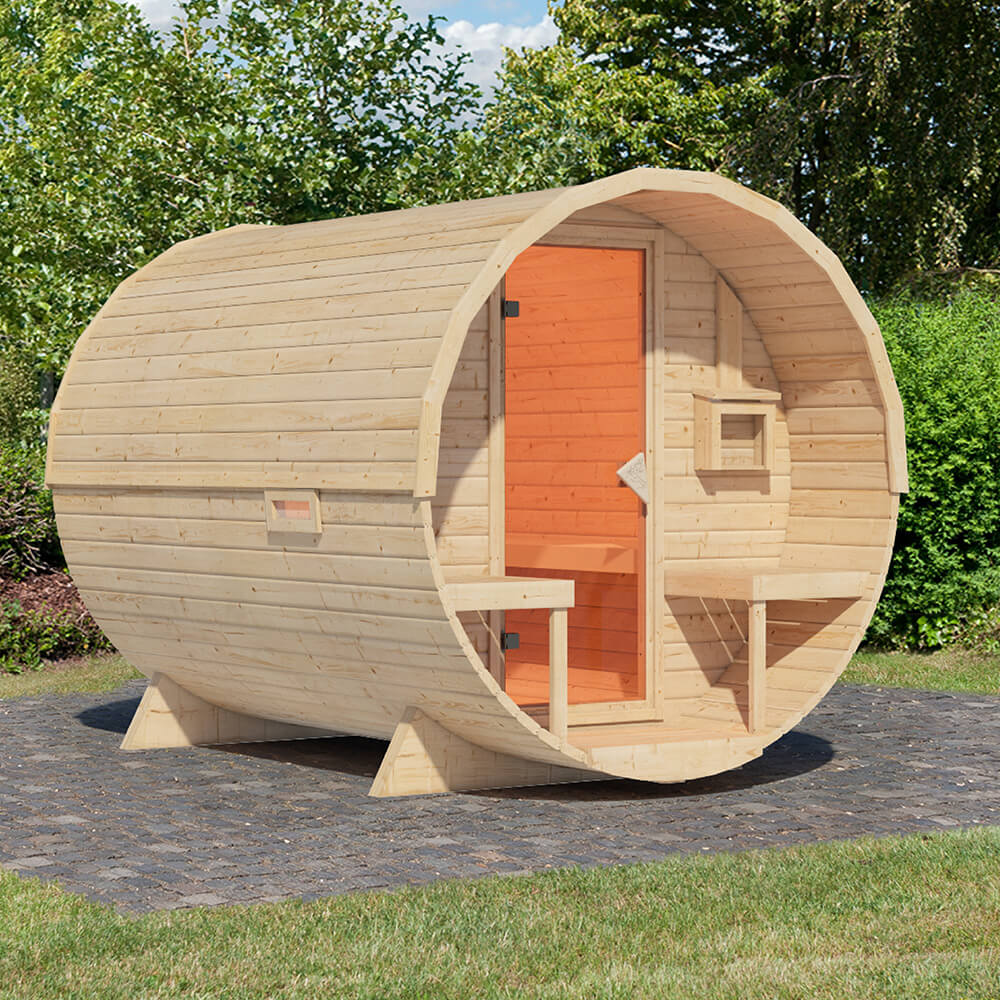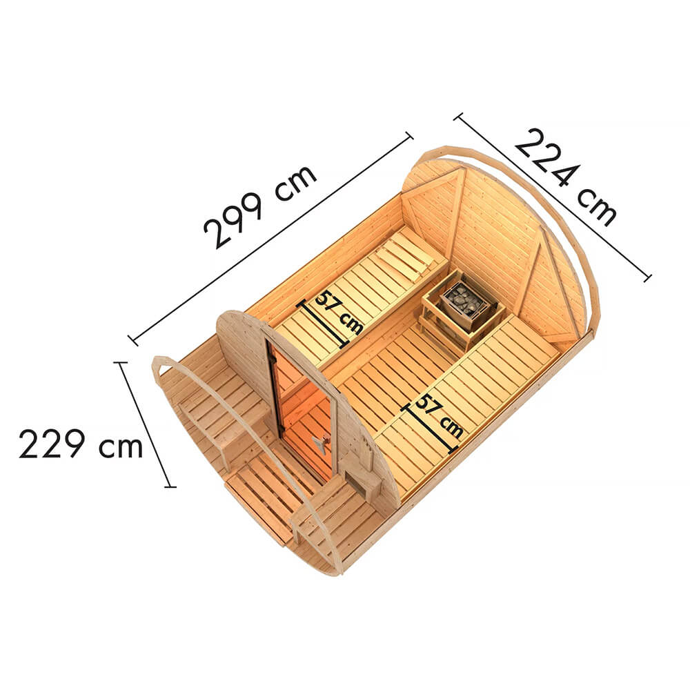 Setzen Sie Ihrem Garten die Krone auf mit der Fasssauna 2. Durch seine runde Form wird die Außensauna ganz bestimmt zu einem Highlight in Ihrem Garten. Doch die Sauna dient nicht nur als Verschönerung in Ihrem Garten. Wer möchte nach einem anstrengenden Tag nicht gerne den Abend in Ruhe bei einem ausgiebigen Saunagang ausklingen lassen. Mit der Fasssauna 2 ist dies ohne weiteres möglich. Die Sauna verfügt über ein Gesamtmaß von (BxTxH) 216x580x216 cm und passt so bestimmt auch in Ihren Garten. Betreten können Sie die Sauna durch eine bronzierte Ganzglastür aus 8mm starkem Sicherheitsglas. Im Inneren können Sie auf zwei 50cm breiten Liegen zur Ruhe kommen und sich für ein paar Minuten vom Alltagsstress verabschieden. Nach dem erholsamen Saunagang können Sie auf zwei Außenbänken runterkühlen und die Entspannung auf Ihren Körper wirken lassen. Die Fasssauna besteht aus nordischem Fichtenholz. 9cm starke, stabile Fundamenthölzer verhindern ein wegrollen und halten die Sauna sicher an ihrem Platz. 42mm starken Bohlen dienen als Wand während 28mm starke Bohlen die Vorder- und Rückseite verschließen. Damit die Bohlen an Ort und Stelle bleiben, werden sie durch Spannreifen gehalten. Diese müssen mit der Zeit regelmäßig nachjustiert werden, um stets ein perfektes Saunaerlebnis sicherzustellen. Ausgestattet mit einem optionalen 9kW- Saunaofen mit externer Steuerung oder dem 9kW-Bio-Kombiofen steht Ihrem ausgiebigen Saunieren nichts mehr im Wege. Abgerundet wird das Gesamtbild mit optional erhältlichen Dachschindeln. Durch die runde Form erleben Sie in der Sauna eine einmalige Luft- und Wärmezirkulation. So kann sich die Wirkung noch besser entfalten. Lehnen Sie sich zurück, schließen Sie die Augen und entspannen Sie sich in der angenehm warmen Saunaluft mit der Fasssauna 2 mit einer ganz besonderen Optik.