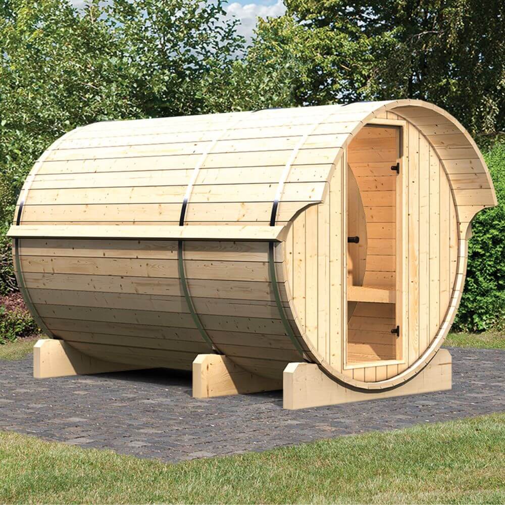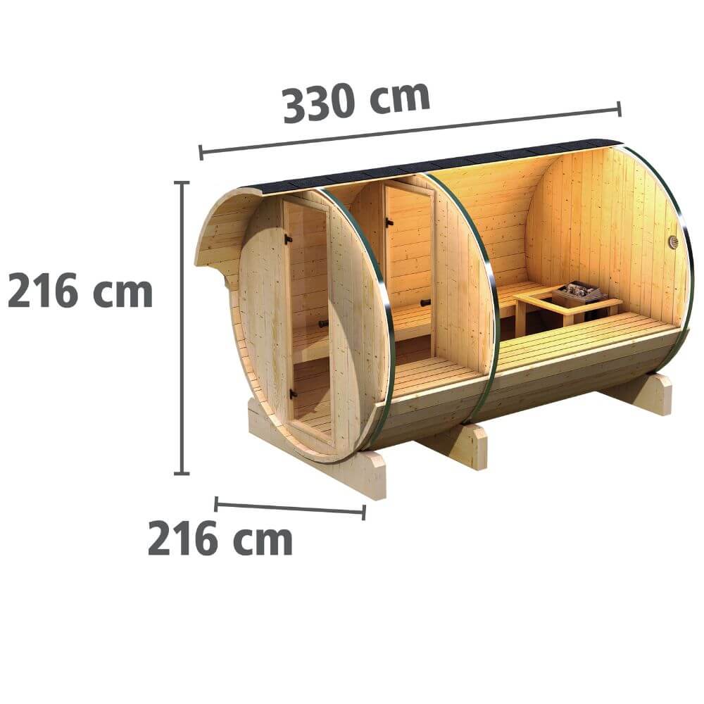 Setzen Sie Ihrem Garten die Krone auf mit der Fasssauna 3 . Durch seine runde Form wird die Außensauna ganz bestimmt zu einem Highlight in Ihrem Garten. Doch die Sauna dient nicht nur als Verschönerung in Ihrem Garten. Wer möchte nach einem anstrengenden Tag nicht gerne den Abend in Ruhe bei einem ausgiebigen Saunagang ausklingen lassen. Mit der Fasssauna 3 ist dies ohne weiteres möglich. Die Sauna verfügt über ein Gesamtmaß von (BxTxH) 216x330x216 cm und passt so bestimmt auch in Ihren Garten. Betreten können Sie die Sauna durch eine bronzierte Ganzglastür aus 8mm starkem Sicherheitsglas. Im Inneren können Sie auf zwei 50cm breiten Liegen zur Ruhe kommen und sich für ein paar Minuten vom Alltagsstress verabschieden. Nach dem erholsamen Saunagang können Sie in einem gemütlichen Vorraum mit zwei Bänken zur Ruhe kommen und die Entspannung auf Ihren Körper wirken lassen. Die Fasssauna besteht aus nordischem Fichtenholz. 9cm starke, stabile Fundamenthölzer verhindern ein wegrollen und halten die Sauna sicher an ihrem Platz. 42mm starken Bohlen dienen als Wand während 28mm starke Bohlen die Vorder- und Rückseite verschließen. Damit die Bohlen an Ort und Stelle bleiben, werden sie durch Spannreifen gehalten. Diese müssen mit der Zeit regelmäßig nachjustiert werden, um stets ein perfektes Saunaerlebnis sicherzustellen. Ausgestattet mit einem optionalen 9kW- Saunaofen mit externer Steuerung oder dem 9kW-Bio-Kombiofen steht Ihrem ausgiebigen Saunieren nichts mehr im Wege. Abgerundet wird das Gesamtbild mit optional erhältlichen Dachschindeln. Durch die runde Form erleben Sie in der Sauna eine einmalige Luft- und Wärmezirkulation. So kann sich die Wirkung noch besser entfalten. Lehnen Sie sich zurück, schließen Sie die Augen und entspannen Sie sich in der angenehm warmen Saunaluft mit der Fasssauna 3 mit einer ganz besonderen Optik.