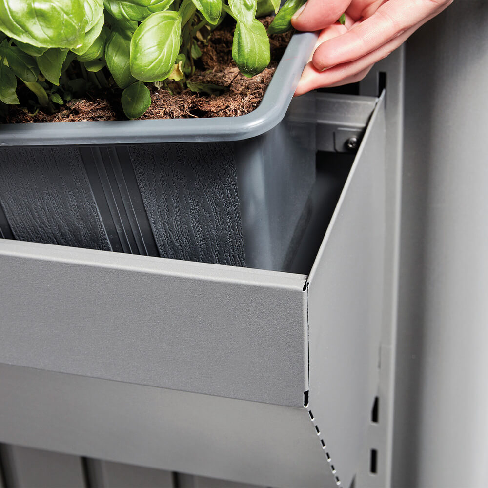 Zwei Steher werden an der Außenwand des Gerätehauses angeschraubt und die Blumenkästen in beliebiger Höhe eingehängt. Kunststoffeinsätze, zur einfacheren Bepflanzung, werden standardmäßig mitgeliefert.