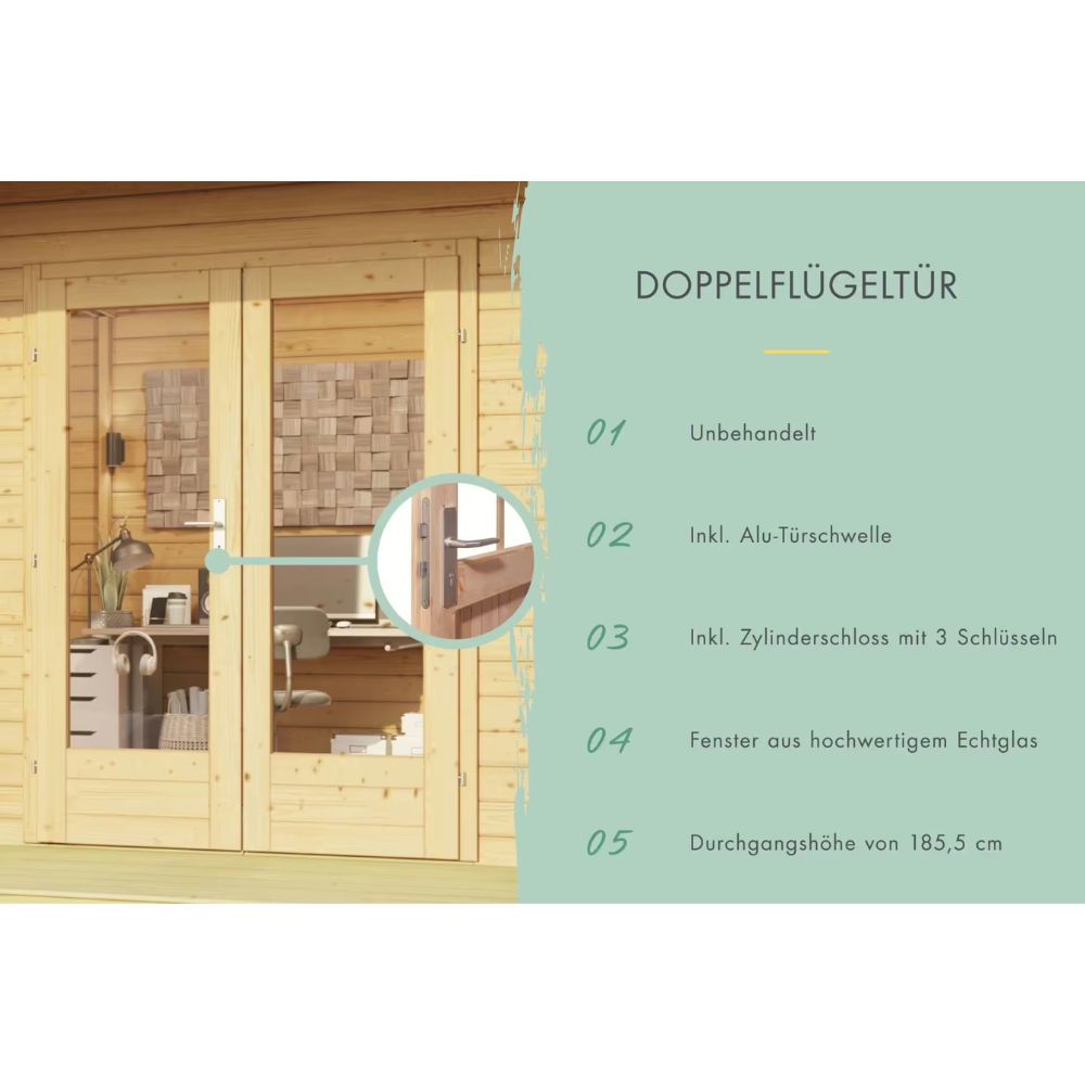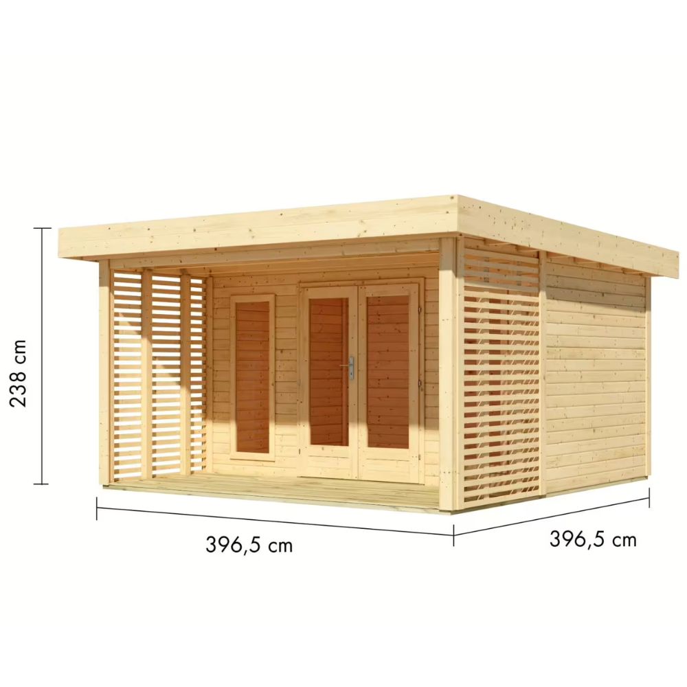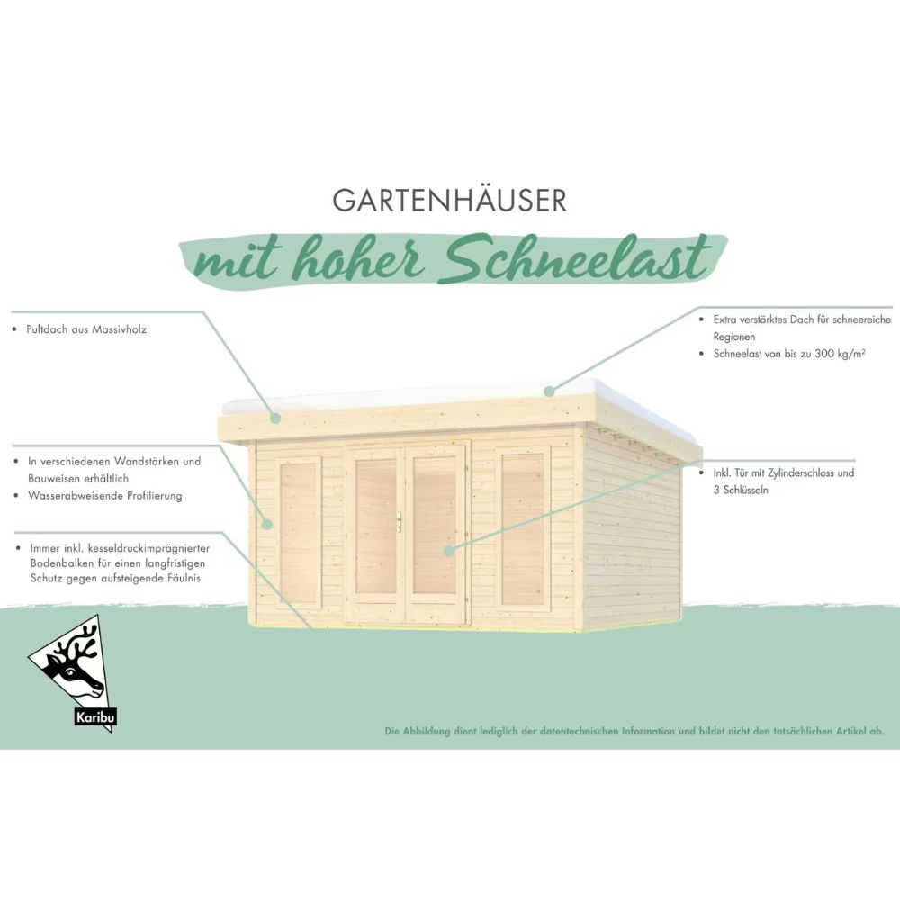 Unser Blockbohlenhaus Chione verfügt über eine besonders hohe Schneelast von 185 kg/m². Das Gartenhaus wird aus 38 mm starken Wandbrettern aus nordischer Fichte im Steck-/Schraubsystem gefertigt und gewährleistet somit einen einfachen Aufbau und eine extrem stabile Konstruktion mit doppeltem Nut- und Federbereich der Wandbretter. Das Pultdach besteht aus Massivholz. Die große 150cm tiefe Terrasse und der vordere Dachüberstand von 300 mm schützt den Eingangsbereich darüber hinaus wirkungsvoll. Die Grundfläche beträgt 15,72 qm bei einem umbauten Raum von 33,0 cbm. Mit einer Seitenhöhe von 212 cm und einer Firsthöhe von 238 cm bietet das Gartenhaus optimale Raumnutzung. Das Gartenhaus hat ein Sockelmaß von 393 cm x 393 cm. Bodenbalken sorgen für den Schutz von unten und werden unter das Gartenhaus gelegt. Durch die Kesseldruckimprägnierung der Bodenbalken sind diese vor Witterungseinflüssen und holzzersetzenden Pilzen bereits geschützt. Die praktische und vormontierte Tür sorgt mit Ihren großzügigen Abmessungen und dem Massivholzrahmen für einen einfachen Zutritt in das Gartenhaus und sichert den Inhalt nebenbei effektiv vor unbefugtem Zugriff. Die Verglasung der Lichtausschnitte sorgt für großzügigen Tageslichteinfall.