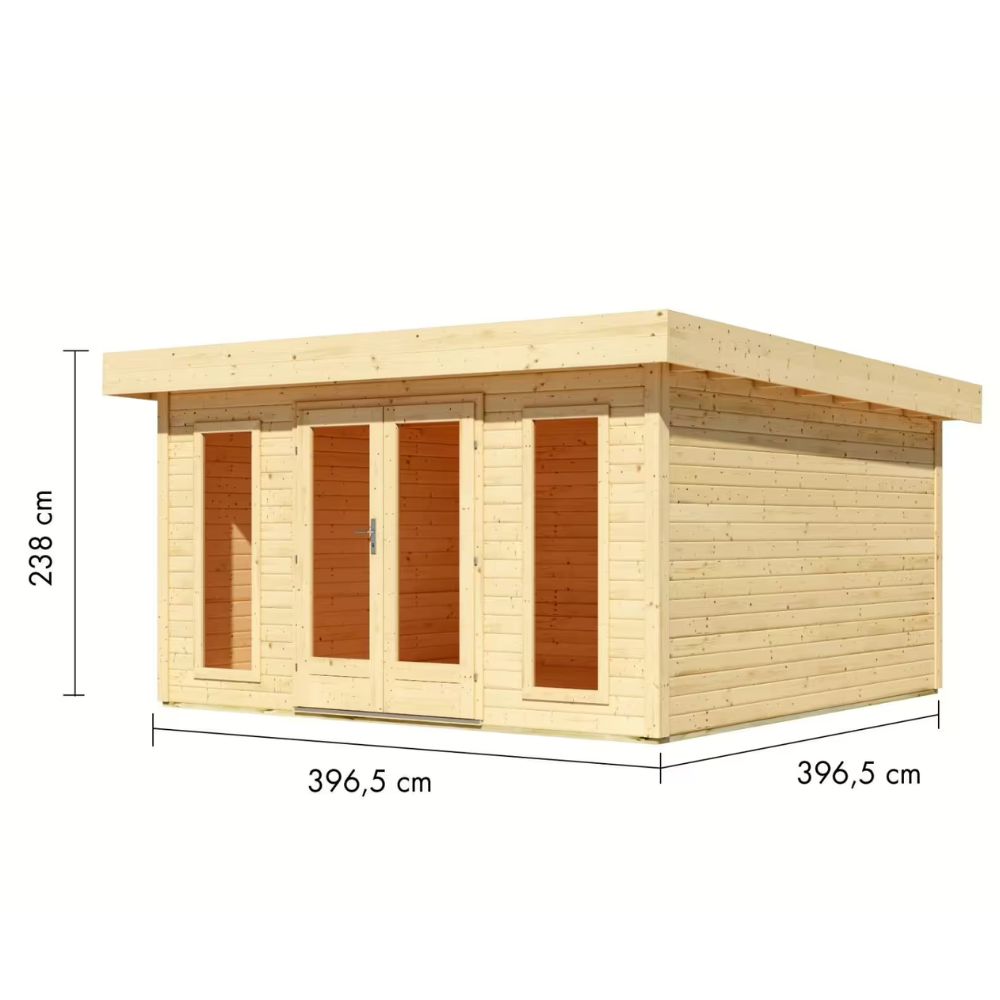 Unser Blockbohlenhaus North verfügt über eine besonders hohe Schneelast von 185 kg/m². Das Gartenhaus wird aus 38 mm starken Wandbrettern aus nordischer Fichte im Steck-/Schraubsystem gefertigt und gewährleistet somit einen einfachen Aufbau und eine extrem stabile Konstruktion mit doppeltem Nut- und Federbereich der Wandbretter. Das Pultdach besteht aus Massivholz. Der vordere Dachüberstand von 300 mm schützt den Eingangsbereich darüber hinaus wirkungsvoll. Die Grundfläche beträgt 15,72 qm bei einem umbauten Raum von 33,0 cbm. Mit einer Seitenhöhe von 212 cm und einer Firsthöhe von 238 cm bietet das Gartenhaus optimale Raumnutzung. Das Gartenhaus hat ein Sockelmaß von 393 cm x 393 cm. Bodenbalken sorgen für den Schutz von unten und werden unter das Gartenhaus gelegt. Durch die Kesseldruckimprägnierung der Bodenbalken sind diese vor Witterungseinflüssen und holzzersetzenden Pilzen bereits geschützt. Die praktische und vormontierte Tür sorgt mit Ihren großzügigen Abmessungen und dem Massivholzrahmen für einen einfachen Zutritt in das Gartenhaus und sichert den Inhalt nebenbei effektiv vor unbefugtem Zugriff. Die Verglasung der Lichtausschnitte sorgt für großzügigen Tageslichteinfall.