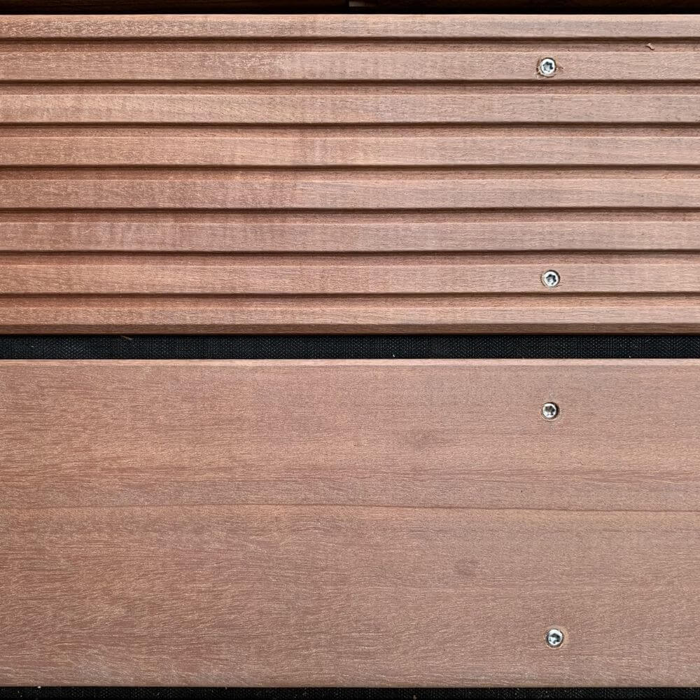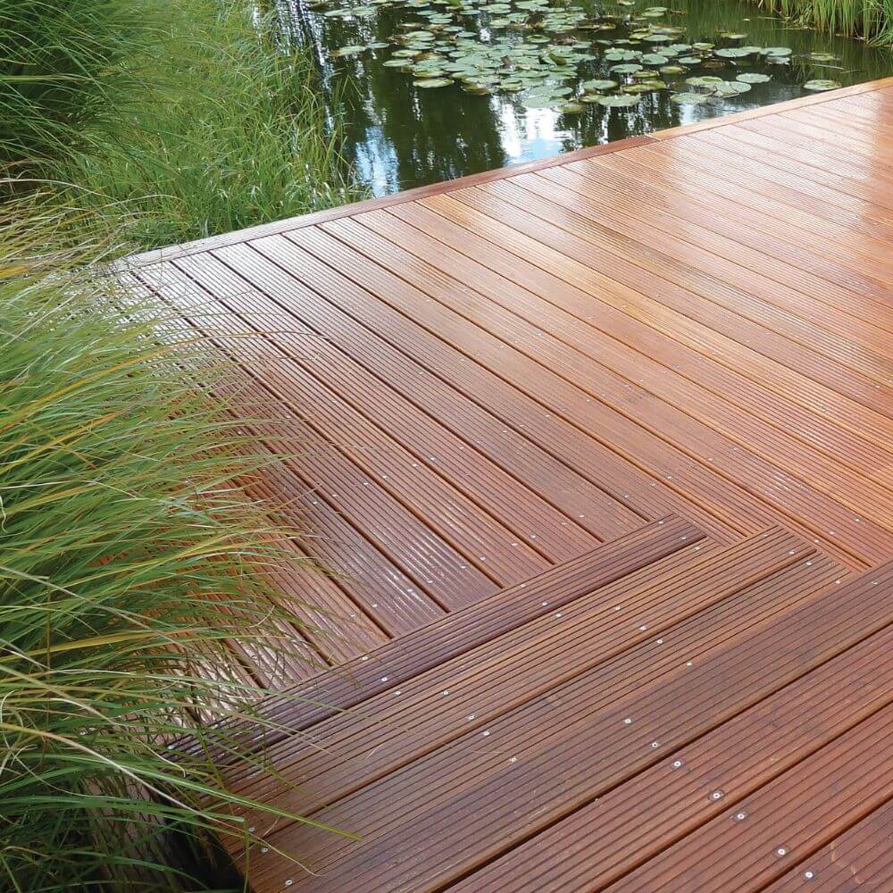 Mukulungu Terrassendiele ( Autranella congolensis ) Vereinzelnd kleine Wurmlöcher (Pinholes) und Wasserflecken sind zu akzeptieren, da diese keine Auswirkung auf die Qualität haben. Holz ist ein Naturprodukt und in Ausdruck und Farbe schwankend. Das Holz hat einen ebendigen Faserverlauf mit oft charakteristischen, dunklen Adern. Die angegebenen Merkmale stellen keinen Grund zur Reklamation dar. Eisengerbstoffreaktionen können zu dunklen Verfärbungen führen, so dass nur Edelstahlschrauben Verwendung finden sollten. ACHTUNG: Beachten Sie bei der Planung und Zwischenlagerung, dass insbesondere bei frischem Holz Kerninhaltstoffe auswaschen. Das Vergrauen von Holz im Außenbereich ist ein natürlicher Prozess. Dabei werden die farbgebenden Substanzen des Holzes -in photochemischen Reaktionen durch ultraviolettes Licht - aufgespalten und anschließend durch das Beregnen ausgewaschen. Dauerhaftigkeitsklasse 1