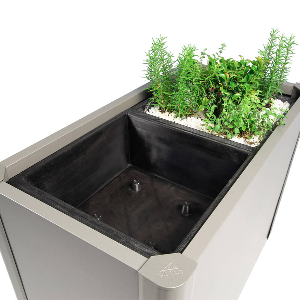 Der Pflanzeinsatz wird für eine einfachere Bepflanzung auf dem Zwischenboden platziert. Zur Entwässerung können problemlos Löcher gebohrt werden.