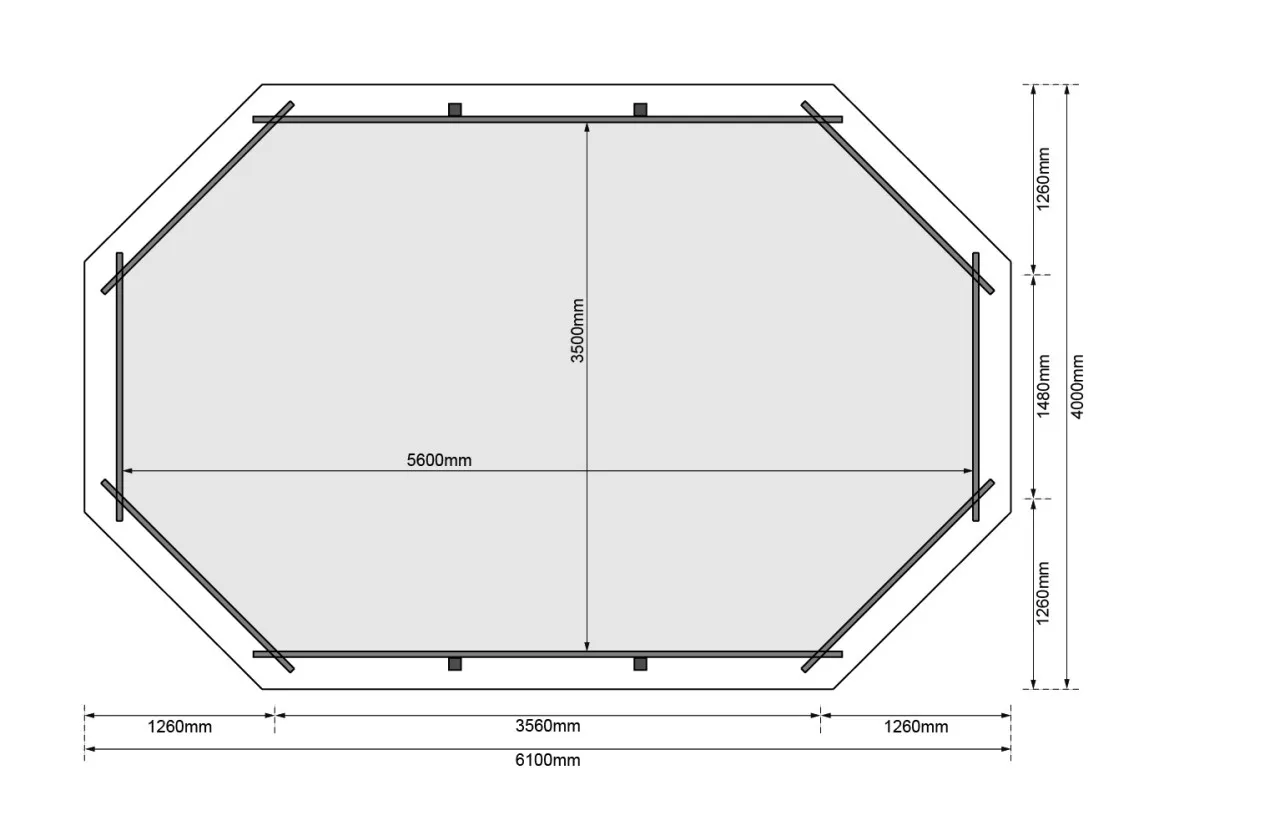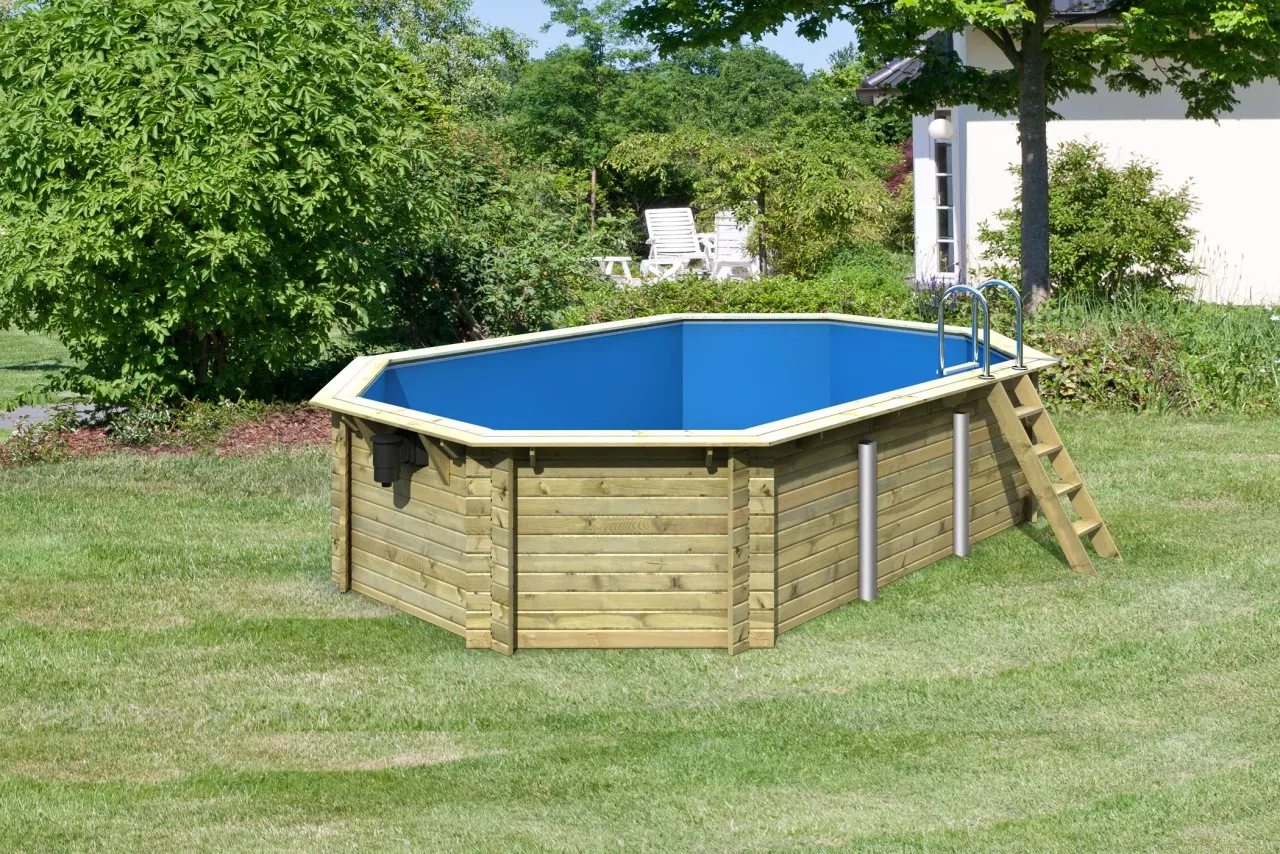 Sommer, Sonne, Spaß – das bringt der Achteckpool Modell 4 . Mit einem Maß von 400 x 610 cm und einer Füllmenge von ca. 19000 Litern, hat der Pool eine ideale Größe. So können Sie sich ganz einfach im eigenen Pool im Garten an einem heißen Sommertag entspannen. Spielen Sie mit Ihren Kindern im Wasser oder entspannen Sie auf einer Luftmatratze in der Sonne. Erweitern Sie Ihren Pool wahlweise durch eine von drei Terrassen-Varianten. Beobachten Sie Ihre Kleinen beim Plantschen, während Sie auf einem Liegestuhl auf der Terrasse die Sonne genießen. Der Pool besteht aus 38mm starken, kesseldruckimprägnierten Blockbohlen, welche im klassischen Blockbohlensystem montiert werden. Im Inneren sorgt eine 0,6mm starke PVC-Folie für den Wassererhalt und ein angenehmes Gefühl unter Ihren Füßen. Bei einer max. Wasserhöhe von 111 cm können Sie sich beim lockeren Schwimmen entspannen und haben bei Bedarf dennoch einen sicheren Stand. Auf das Deck des Pools gelangen Sie über eine Holzleiter aus Fichten und weiter über eine Edelstahlleiter in das kühle Nass. Liegt der nächste Urlaub noch in weiter Ferne schaffen Sie sich mit dem Achteckpool im Garten Ihr eigenes kleines Urlaubsfeeling. Ein bisschen Sand um den Pool geschüttet, ein paar Palmen aufgestellt und schon haben Sie Ihren eigenen kleinen privaten Strand. Einen Drink aus einer Kokosnuss und eine Blumenkette um den Hals und schon können Sie sich auf Ihrem Liegestuhl in die Südsee träumen. Wenn es dann zu warm wird tauchen Sie in das kühle Wasser ein. Erweitern Sie Ihre Möglichkeiten im eigenen Garten und holen Sie sich ein bisschen Urlaubsfeeling nach Hause mit dem Achteckpool 4.