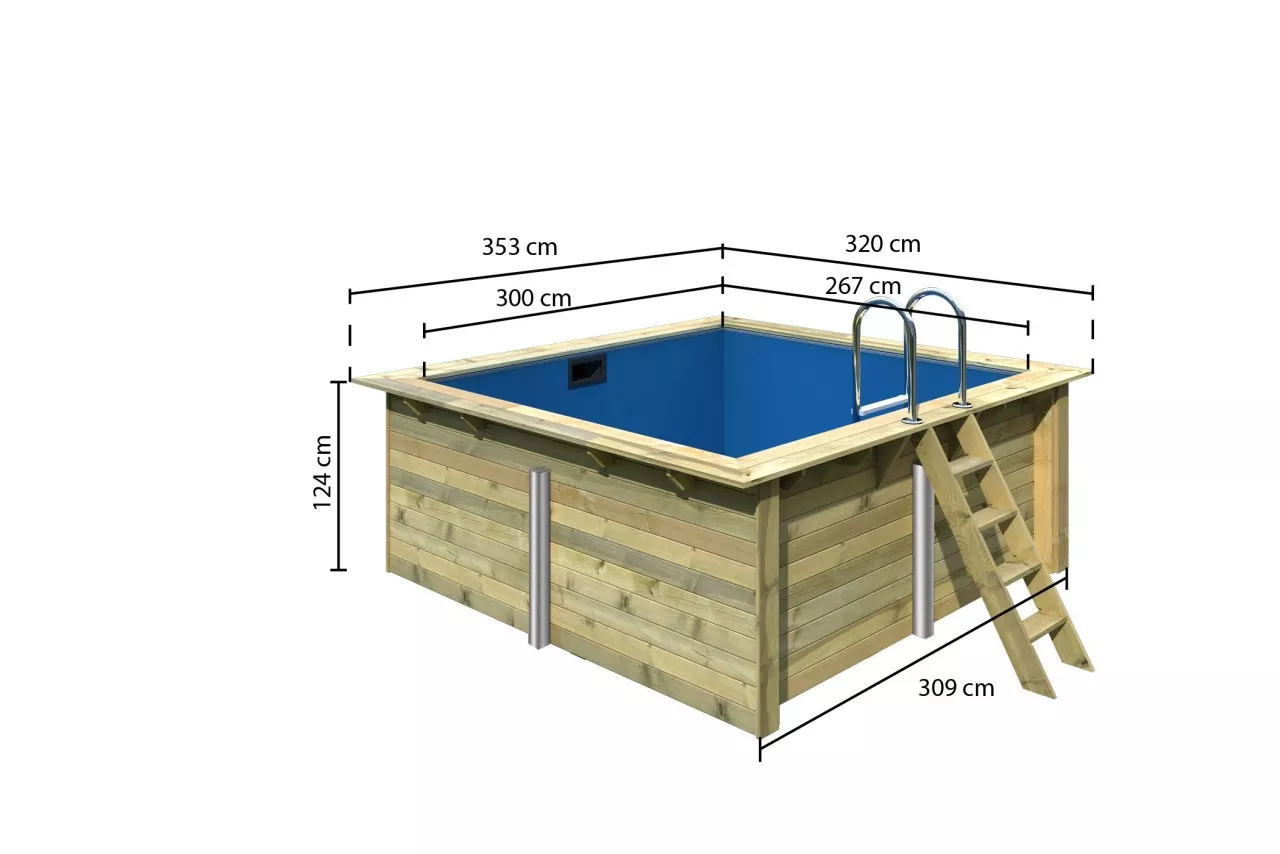 Sommer, Spaß und Entspannung! Mit dem richtigen Pool wird der Garten zum Erholungsort und Spaßbad in einem. Das Beste an unseren Rechteckpools: Durch die spezielle Kessdruckimprägnierung Klasse 4 kann dieser Pool in den Boden eingesetzt werden. Der Rechteckpool 1 hat ein Außenmaß von 350x320 cm. Mit einer Füllmenge von 9772 Liter ist jede Menge Badespaß vorgesehen. Erweitern Sie Ihren Pool optional mit 2 möglichen Terrassen und erschaffen sich einen Sonnenplatz. Beobachten Sie Ihre Kleinen beim Plantschen, während Sie auf einem Liegestuhl auf der Terrasse die Sonne genießen. Der Pool besteht aus 44mm starken, kesseldruckimprägnierten Blockbohlen, welche im klassischen Steck- und Schraubsystem montiert werden. Im Inneren sorgt eine 0,6mm starke PVC-Folie für den Wassererhalt und ein angenehmes Gefühl unter Ihren Füßen. Bei einer max. Wasserhöhe von 111 cm können Sie sich beim lockeren Schwimmen entspannen und haben bei Bedarf dennoch einen sicheren Stand. Liegt der nächste Urlaub noch in weiter Ferne schaffen Sie sich mit dem Rechteckpoolim Garten Ihr eigenes kleines Urlaubsfeeling. Ein bisschen Sand um den Pool geschüttet, ein paar Palmen aufgestellt und schon haben Sie Ihren eigenen kleinen privaten Strand. Einen Drink aus einer Kokosnuss und eine Blumenkette um den Hals und schon können Sie sich auf Ihrem Liegestuhl in die Südsee träumen. Wenn es dann zu warm wird tauchen Sie in das kühle Wasser ein. Erweitern Sie Ihre Möglichkeiten im eigenen Garten und holen Sie sich ein bisschen Urlaubsfeeling nach Hause mit dem Rechteckpool 1.
