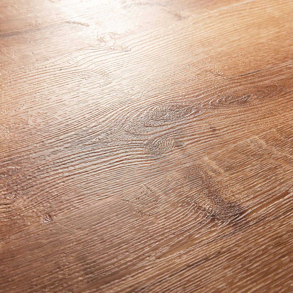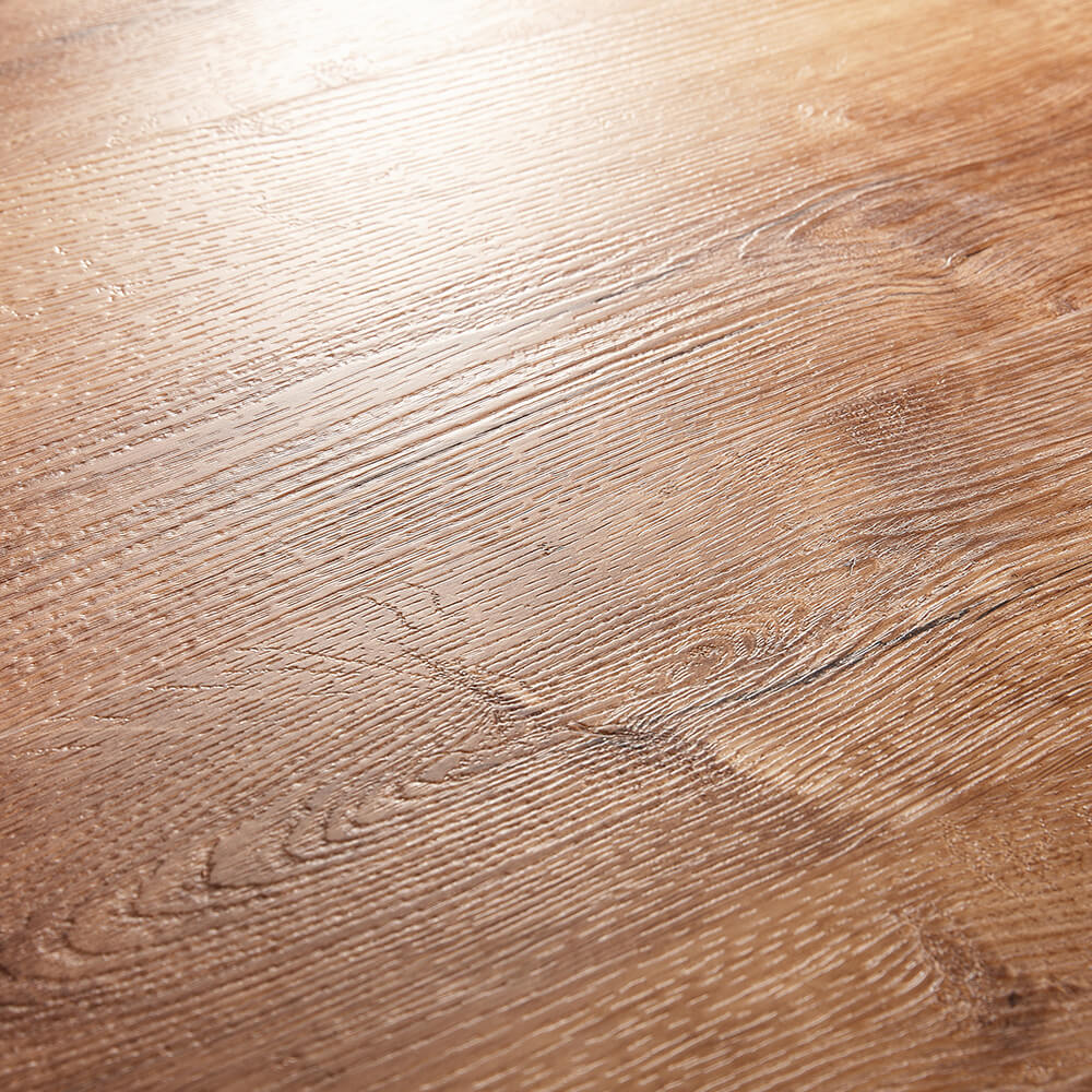 Die Oberfläche dieses erstklassigen Vinyl Designbodens ist Synchrongeprägt. Was bedeutet, dass das aufgedruckte Holzbild durch eine der Maserung folgenden Textur unterstützt wird und somit optisch und haptisch kaum noch von echtem Holz zu unterscheiden ist. Für ein angenehmes Wohlgefühl sorgt die fußwarme Nutzschicht mit einer Dicke von 0,55 mm, welche besonders positiv auffällt, wenn der Boden barfuß begangen wird. Zudem besitzt das Produkt eine integrierte Trittschalldämmung aus Kork.