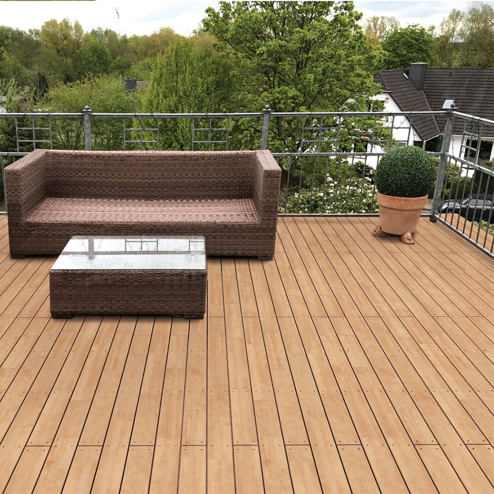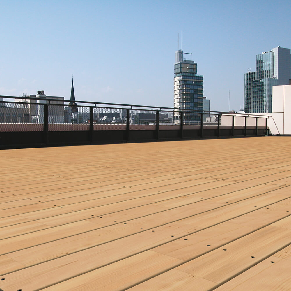 ACHTUNG: Aufgrund der Keilzinkung ist die Verlegung ohne Gefälle nicht zulässig. Es würde die Lebensdauer der Dielen stark reduzieren, zu mehr Oberflächenrissen kommen, den Reinigungsaufwand steigern, Wasserränder erzeugen und die Rutschigkeit der Terrasse erhöhen.
