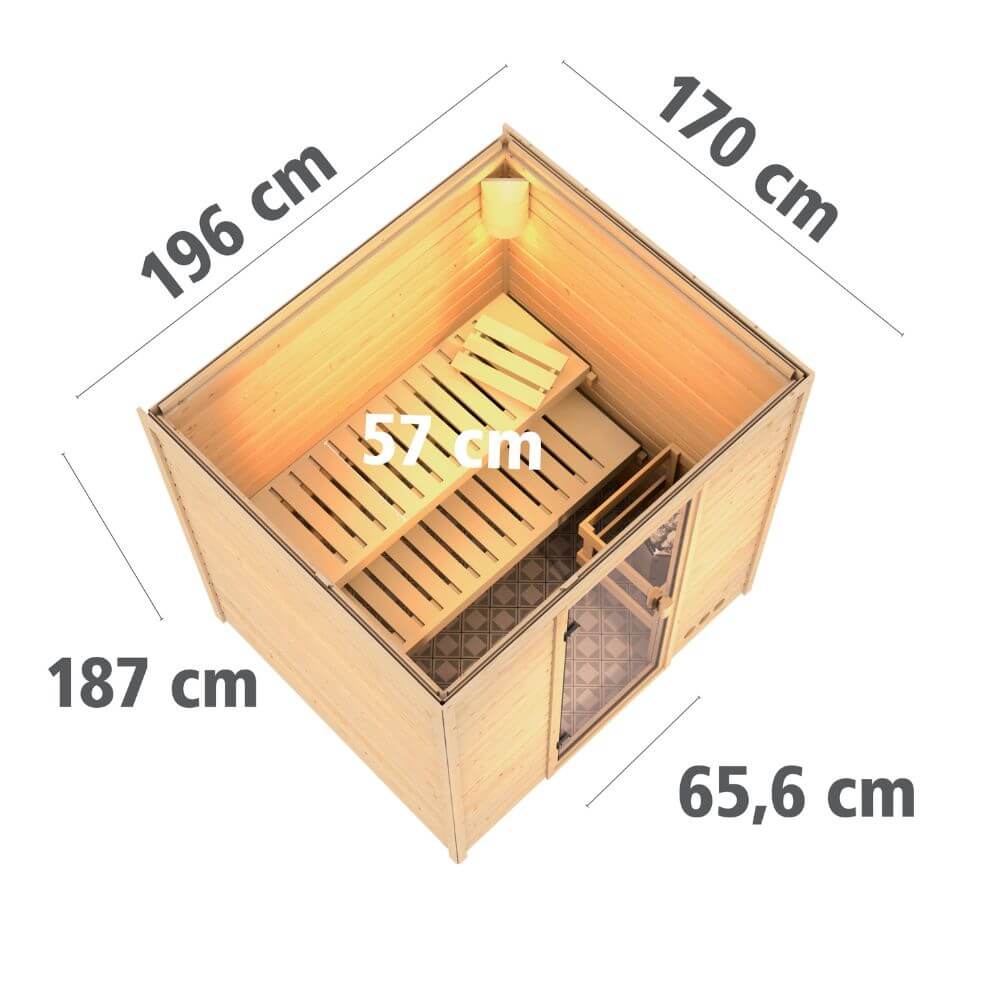 Was eignet sich für einen bislang ungenutzten Kellerraum besser, als eine eigene Sauna zum Entspannen und Wohlfühlen? Die Sauna Adelina hat ein Außenmaß von 195 x 169 cm und ist, aufgrund seiner geringen Höhe von 187 cm, ideal auch für Räume mit einer niedrigen Deckenhöhe geeignet. Die Massivholzsauna besteht aus 38mm starken Wandbohlen aus nordischer Fichte, welche im einfachen Steck- und Schraubsystem montiert werden. Durch den Fronteinstieg und die schlichte, rechteckige Form passt sie sich jeder Umgebung mühelos an. Mit einem optional wählbaren Dachkranz inkl. 3 LED-Spots, können Sie die Sauna von außen beleuchten und sie so gekonnt in Szene setzen. In den Innenraum gelangen Sie durch eine bronzierte Ganzglastür aus Einscheibensicherheitsglas. Damit beim Saunieren keine Wärme entweichen kann, wird die Tür durch eine Magnetverschlusstechnik geschlossen gehalten. Auf den, im Lieferumfang enthaltenen, Liegen können Sie den Saunagang so richtig genießen. Verschönern Sie das Ambiente in Ihrer Sauna und sorgen Sie für die größtmögliche Erholung mit unserem optional erhältlichen Zubehör. Eine Saunalampe Classic in der Ecke, eine ergonomische Kopfstütze für die perfekte Liegeposition oder eine Salzkristall Vital Sole für freies Atmen macht Ihren Saunagang zu einem perfekten Erlebnis. Entspannen Sie nach einem stressigen Arbeitstag und schöpfen Sie neue Kraft aus der angenehmen Wärme auf Ihrer Haut. Heizen Sie den Innenraum mit einem optional erhältlichen, klassischen 4,5kW-Ofen. Dieser sorgt aufgrund seiner höheren Leistung für höhere Temperaturen und für ein angenehmes Klima im Innenraum. Der Saunaofen ist in einer Variante mit integrierter Steuerung, einer mit externer Steuerung und als Bio-Kombiofen erhältlich. Nutzen Sie Ihren Kellerraum zur Entspannung und verwandeln Sie ihn in eine Wellness-Oase mit der Massivholzsauna Sauna Adelina.