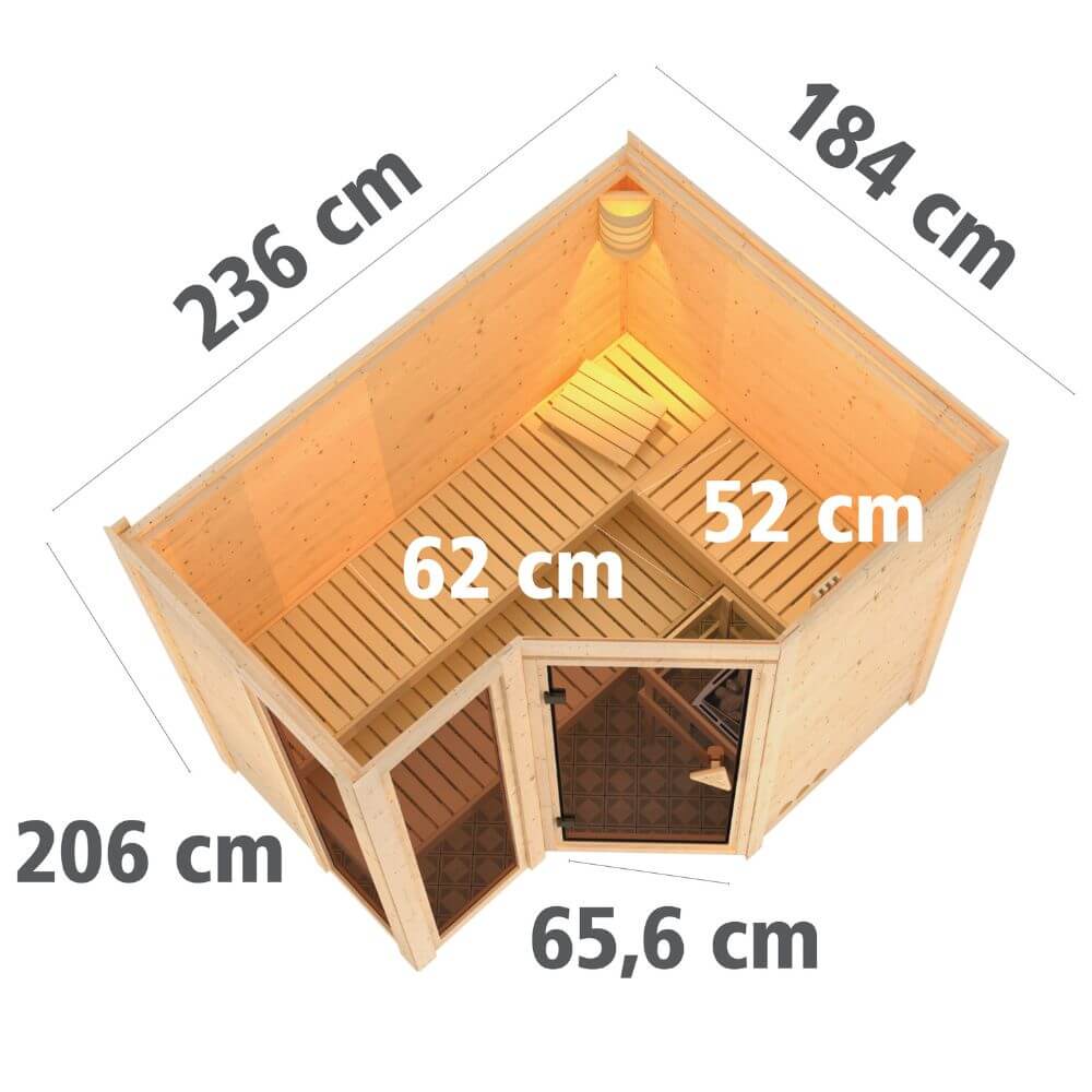 Ein Ort der Ruhe und Entspannung in den eigenen Vier Wänden. Nach einem stressigen Tag die Seele baumeln lassen und sich von der wohligen Wärme in einer Sauna verwöhnen ohne das Haus verlassen zu müssen. Dies ist möglich mit unserer 40mm Massivholzsauna Amara. Die stabile Konstruktion mit 40mm Bohlen aus nordischem Fichtenholz wird im einfachen Steck-/ Schraubsystem montiert. Durch die massiven Vollholzwände wird im Saunainneren ein ideales Raumklima nach finnischem Vorbild geschaffen. Ein optional wählbarer Dachkranz inkl. 3 LED-Spots setzt die Sauna gekonnt in Szene. Das Innere der Sauna erreichen Sie durch eine bronzierte Ganzglastür aus Einscheibensicherheitsglas mit Karibu-Türgriff. Durch die Tür und die beiden bronzierten Fenster gelangt Licht in den Innenraum und sorgt durch die bronzierten Gläser für ein warmes Ambiente. Mit einem Außenmaß von 236 x 184 x 209 cm (H/B/T) besitzt die Sauna Amara die ideale Größe zum Entspannen und Wohlfühlen. Erweitern Sie Ihre Möglichkeiten mit dem optional erhältlichen 9kW-Bio-Kombiofen. Neben einer klassischen finnischen Sauna haben Sie hier die Möglichkeit einer Kräuterdampf-Kur, einem Dampfbad und einer Familiensauna. So wird es zu einem Saunaerlebnis für die ganze Familie. Lassen Sie sich von der wohltuenden Wirkung des Saunabadens überzeugen. Bei regelmäßiger Anwendung fühlen Sie sich nicht nur deutlich entspannter. Zusätzlich wirkt es sich positiv auf den Stoffwechsel aus, verfeinert das Hautbild und unterstützt den Stressabbau. Um ein besonderes Sauna-Gefühl zu schaffen, wird die Sauna mit 3 Saunaliegen und einer Kopfstütze ausgestattet. Durch eine extra breite Saunaliege von 62cm Breite wird Ihnen ein besonders angenehmer Liegekomfort geboten. Ein Ofenschutzgitter schützt Sie vor Verbrennungen durch den Saunaofen. Mit einer optional erhältlichen Salzkristall Vital Sole oder der Salzkristall-Leuchte können Sie Ihre Atemwege befreien und wieder tief ein- und ausatmen. Genießen Sie die zahlreichen Vorteile des Saunieren und schaffe Sie einen Ort der Ruhe mit der MassivholzsaunaAmara.