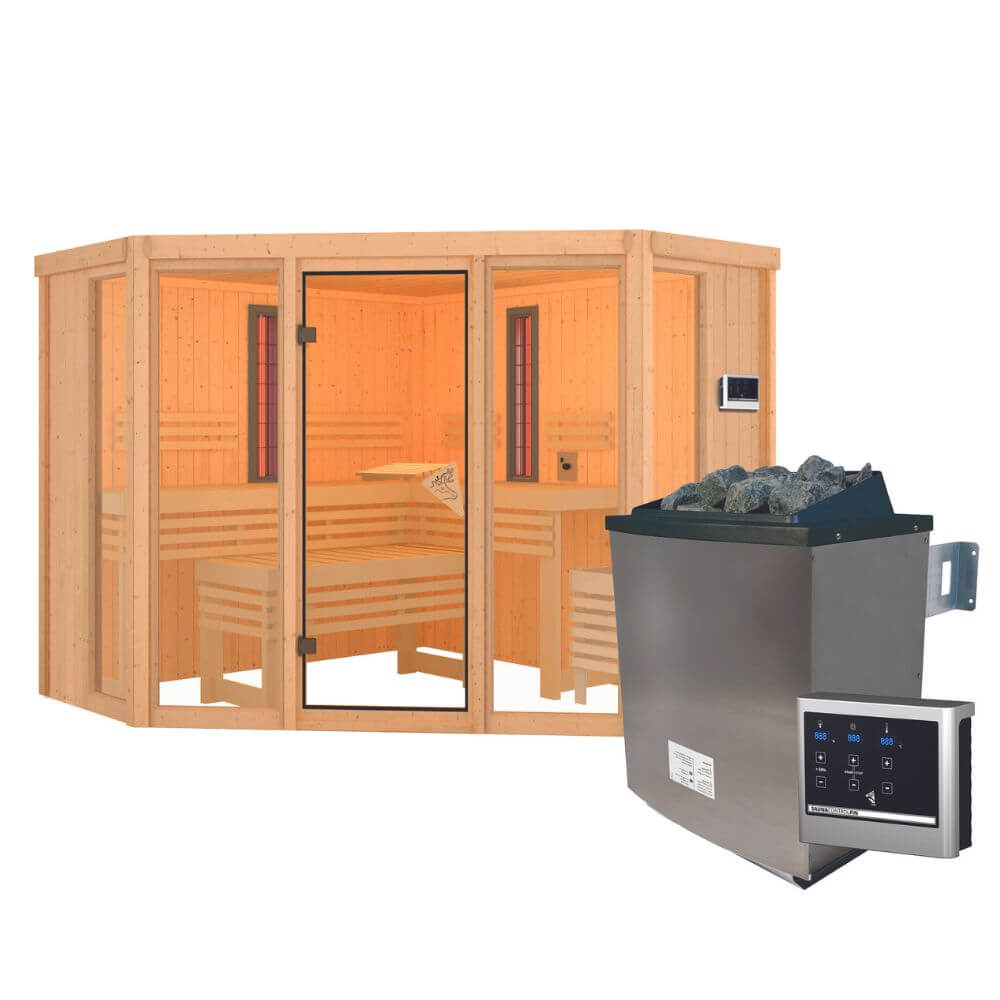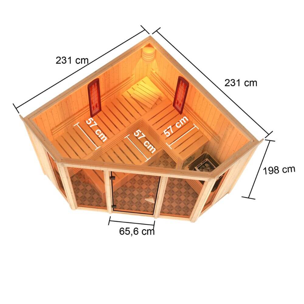 Genau die Entspannung, die Sie sich wünschen. Die Sauna-Infrarot-Kombination Asta lässt ist eine Sauna, die keine Wünsche mehr offen lässt. Nutzen Sie die warme und beruhigende Saunaluft und stärken Sie Ihr Herz-Kreislauf-System oder nutzen Sie die Tiefenwirkung der Infrarotstrahler bei Muskelbeschwerden und Verspannungen. Mit der Multifunktionssauna … sind Sie auf alles vorbereitet. Ausgestattet mit einem 9kW-Saunaofen, zwei Infrarotstrahlern, drei Saunaliegen aus weichem Espenholz, Bankblenden und Rückenlehnen, einem Ofenschutzgitter-Premium und einer Kopfstütze bringt die Sauna bereits alles mit, was Ihr Herz begehrt. Nach einem langen und harten Arbeitstag im Büro passiert es schnell, dass sich Ihr Rücken verspannt. Nun zur Erholung schnell in die Sauna und die Infrarot-Strahler angeschaltet. Im Nu sind Ihre Muskeln entspannt und Ihre Beschwerden gelindert. Mit einem Außenmaß von Ihrer Wellness-Oase.231 x 231 x 202 cm (B/T/H) ohne Dachkranz bietet die Sauna genug Platz. Genießen Sie die Möglichkeiten alleine oder mit der ganzen Familie. Die Saunabänke verfügen über eine Breite von 57 cm und ermöglichen so ein angenehmes Liegen. Bei dem Ofen können Sie zwischen einem 9kW-Ofen mit externer Steuerung oder einem 9kW-Bio-Kombiofen mit externer Steuerung wählen. Der Bio-Kombiofen verfügt, neben der klassischen finnischen Sauna, auch über eine Verdampfereinheit. Dies ermöglicht auch eine Kräuterdampf-Kur, ein Soft-Dampfbad-Feuchtwarm und eine Familiensauna. So ist garantiert für jeden das Richtige dabei. Ein echtes Highlight bieten die vier großzügigen Fenster in der Sauna. Diese lassen viel Tageslicht in das Innere und sorgen durch das bronzierte Glas für ein schönes Ambiente. Betreten können Sie die Sauna durch eine bronzierte Ganzglastür aus Einscheibensicherheitsglas mit Karibu-Türgriff. Die Wandelemente bestehen aus einer 68mm Rahmenkonstruktion mit Mineralwolldämmung und nordischen Fichtenbrettern. Machen Sie die Multifunktionssauna Asta zu Ihrem ganz persönlichen Highlight in