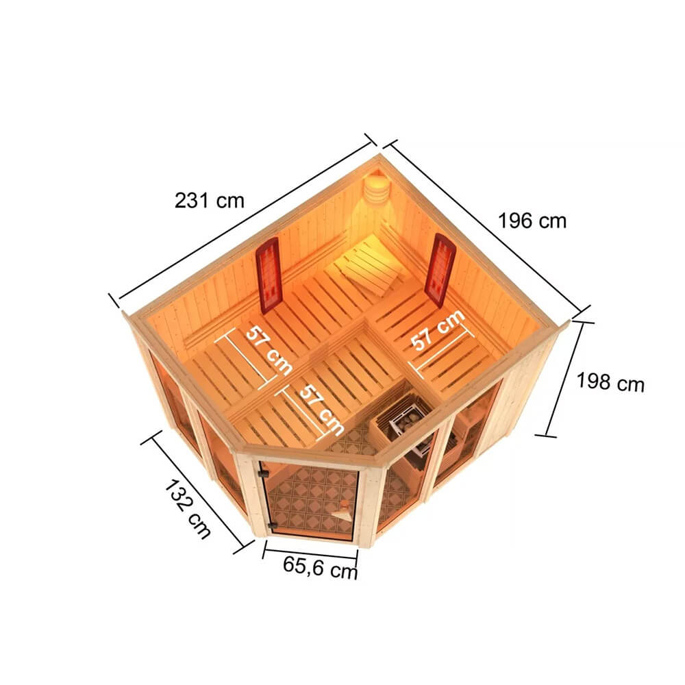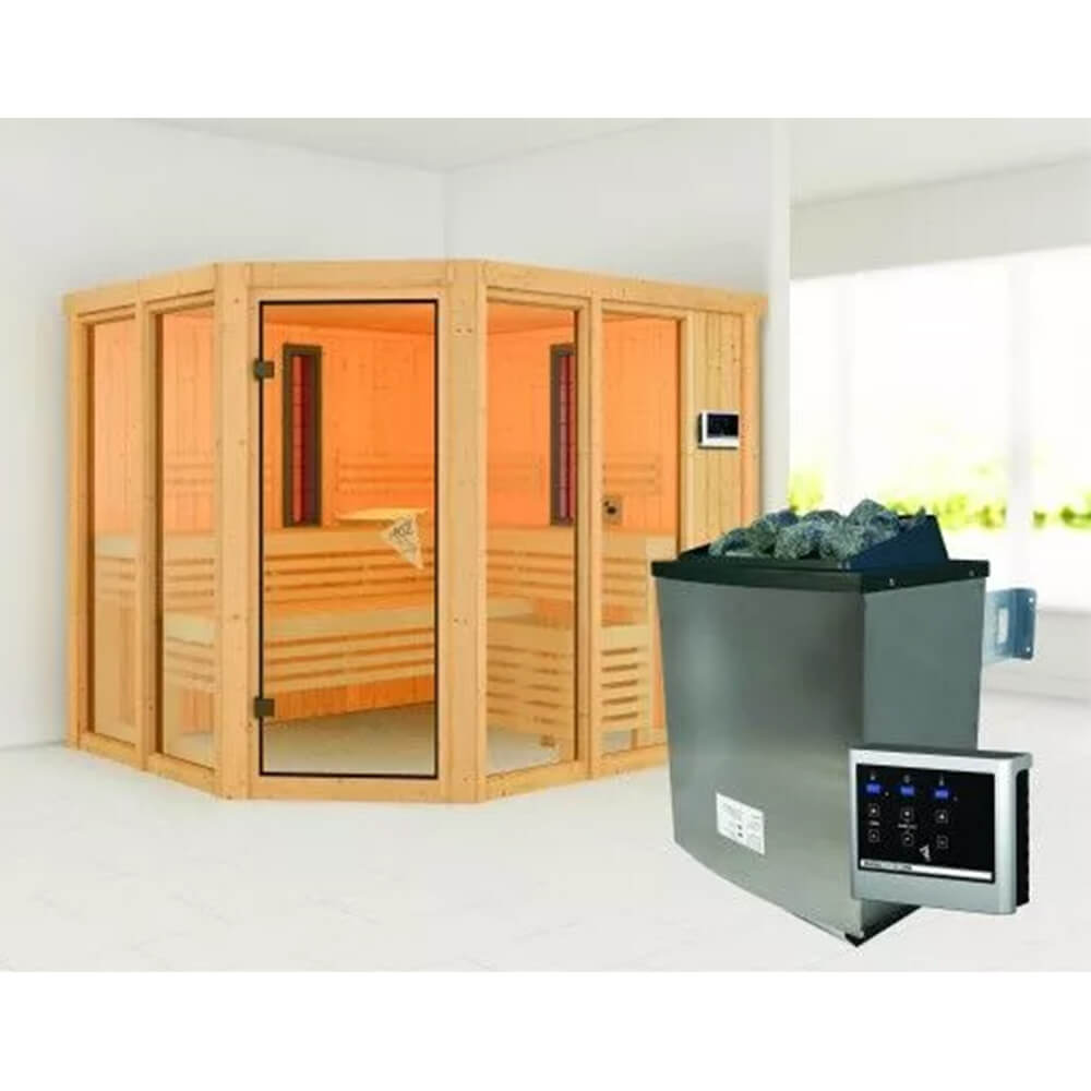 Genau die Entspannung, die Sie sich wünschen. Die Sauna-Infrarot-Kombination Ava lässt ist eine Sauna, die keine Wünsche mehr offen lässt. Nutzen Sie die warme und beruhigende Saunaluft und stärken Sie Ihr Herz-Kreislauf-System oder nutzen Sie die Tiefenwirkung der Infrarotstrahler bei Muskelbeschwerden und Verspannungen. Mit der Multifunktionssauna … sind Sie auf alles vorbereitet. Ausgestattet mit einem 9kW-Saunaofen, zwei Infrarotstrahlern, drei Saunaliegen aus weichem Espenholz, Bankblenden und Rückenlehnen, einem Ofenschutzgitter-Premium und einer Kopfstütze bringt die Sauna bereits alles mit, was Ihr Herz begehrt. Nach einem langen und harten Arbeitstag im Büro passiert es schnell, dass sich Ihr Rücken verspannt. Nun zur Erholung schnell in die Sauna und die Infrarot-Strahler angeschaltet. Im Nu sind Ihre Muskeln entspannt und Ihre Beschwerden gelindert. Mit einem Außenmaß von Ihrer Wellness-Oase.196 x 231 x 202 cm (B/T/H) ohne Dachkranz bietet die Sauna genug Platz. Genießen Sie die Möglichkeiten alleine oder mit der ganzen Familie. Die Saunabänke verfügen über eine Breite von 57 cm und ermöglichen so ein angenehmes Liegen. Bei dem Ofen können Sie zwischen einem 9kW-Ofen mit externer Steuerung oder einem 9kW-Bio-Kombiofen mit externer Steuerung wählen. Der Bio-Kombiofen verfügt, neben der klassischen finnischen Sauna, auch über eine Verdampfereinheit. Dies ermöglicht auch eine Kräuterdampf-Kur, ein Soft-Dampfbad-Feuchtwarm und eine Familiensauna. So ist garantiert für jeden das Richtige dabei. Ein echtes Highlight bieten die vier großzügigen Fenster in der Sauna. Diese lassen viel Tageslicht in das Innere und sorgen durch das bronzierte Glas für ein schönes Ambiente. Betreten können Sie die Sauna durch eine bronzierte Ganzglastür aus Einscheibensicherheitsglas mit Karibu-Türgriff. Die Wandelemente bestehen aus einer 68mm Rahmenkonstruktion mit Mineralwolldämmung und nordischen Fichtenbrettern. Machen Sie die Multifunktionssauna Ava zu Ihrem ganz persönlichen Highlight in