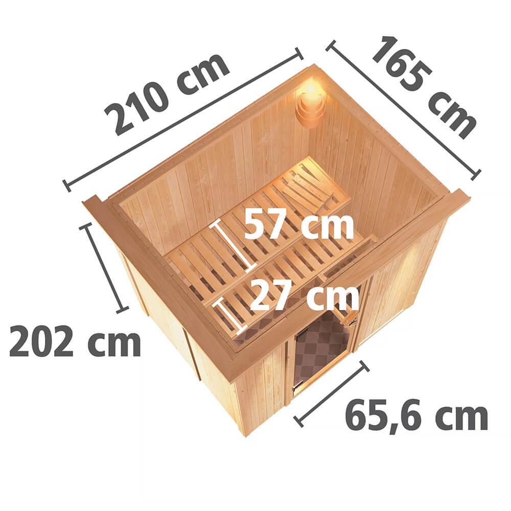 Sparen Sie wertvolle Energie mit der Systemsauna Bodin. Eine 68mm starke Konstruktion, bestehend aus einer Rahmenkonstruktion mit 42mm starker Mineraldämmwolle und einer Verkleidung an der Sichtseite aus 12,5mm Spezial-Softline-Profilholz, hält die Wärme optimal im Saunainneren. Die Decke besteht aus einer 57mm starken Spezialplatte mit Mineraldämmwolle. Die Außenmaße ohne Dachkranz betragen 196 x 151 x 198cm (B/T/H). Die Sauna verfügt über 2 Saunabänke aus Espenholz zum Entspannen und Wohlfühlen. Mit einem optional erhältlichen 4,5kW-Saunaofen bringen Sie das Innere schnell auf Temperatur. Bei dem Ofen können Sie zwischen einer Variante mit integrierter Steuerung, einer Variante mit externer Steuerung oder einem 4,5kW Bio-Kombiofen wählen. So ist garantiert für jeden das Richtige dabei. Durch einen optionalen Dachkranz inkl. drei LED-Spots können Sie Ihre Sauna von außen beleuchten und sie so perfekt in Szene setzen. In den Innenraum gelangen Sie durch eine Saunatür. Hier können Sie sich zwischen vier möglichen Varianten entscheiden. Egal ob klassisch mit bronziertem Glas, modern mit graphitfarbenem Glas, schlicht mit klarem Türglas oder passend mit einer energiesparenden, wärmegedämmten Holztür mit klarem Isolierglas. Durch die vorgefertigten Wand und Deckenelemente wird Ihnen ein einfacher Aufbau ermöglicht. Passen Sie die Sauna auf Ihre Bedürfnisse an mit unserem optional erhältlichen Zubehör. Eine ergonomische Kopfstütze für den optimalen Liegekomfort, eine ergonomische Rückenlehne zur perfekten Entspannung oder eine Saunaleuchte modern für das richtige Ambiente. Genießen Sie die Ruhe nach einem anstrengenden Arbeitstag bei einem ausgiebigen Saunagang und erholen Sie sich vom Alltag. Verringern Sie den Energieverbrauch beim Saunieren mit der 68mm Systemsauna Bodin.