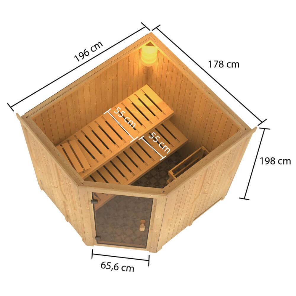 Sparen ohne Qualitätsverlust – mit der System-Sauna Bodo aus 68mm nordischem Fichtenholz. Die Sauna wird mit der einfachen Elementbauweise montiert und ermöglicht so eine schnelle Montage. Mit einem Außenmaß von 196 x 178 x 198 cm (B/T/H) bietet dieses Saunamodell ausreichend Platz zum gemeinsamen Entspannen und Wohlfühlen. Für Sitz – oder Liegemöglichkeiten in der Sauna sorgen die 2 Saunabänke aus nordischem Fichtenholz. Erweitern können Sie die Innenausstattung mit unserem optional erhältlichen Zubehör. Mit dem 3er-SET der Kopfstütze-Premium können Sie nicht nur Ihren Kopf optimal stützen. Durch zusammenschieben zweier Kopfstützen schaffen Sie sich eine Venenstütze für die Beine. Bei Problemen der Atemwege können Ihnen unsere Salzkristalle helfen. Durch anbringen einer Salzkristall-Leuchte oder einer Salzkristall Vital Sole schaffen Sie eine wertvolle, salzhaltige Luft während des Saunierens. Diese ermöglicht eine schonende und wirkungsvolle Behandlung der Atemwege und kann Entzündungen vorbeugen. Erwärmen können Sie die Luft im Saunainneren durch einen optional wählbaren 4,5kW-Saunaofen. Entscheiden Sie sich zwischen einem Ofen mit integrierter Steuerung, einem 4,5kW-Ofen mit externer Steuerung „Easy“ oder unserem Alleskönner, dem 4,5kW Bio-Kombiofen. Mit diesem ist neben dem normalen finnischen Saunieren auch eine Dampfsauna möglich. So können Sie die Sauna ganz leicht auf Ihre Wünsche und Bedürfnisse ausstatten. Vor Verbrennungen am heißen Saunaofen schützt Sie das, im Lieferumfang enthaltene, Ofenschutzgitter. Durch eine bronzierte Ganzglastür aus Einscheibensicherheitsglas mit Magnetverschlusstechnik wird die Saunakabine verschlossen und das Entweichen der Wärme wird verhindert. Richten Sie sich Ihre Saunalandschaft ein, mit der Massivholz-Sauna Bodo und das zu einem fairen Preis ohne Qualitätsverlust.