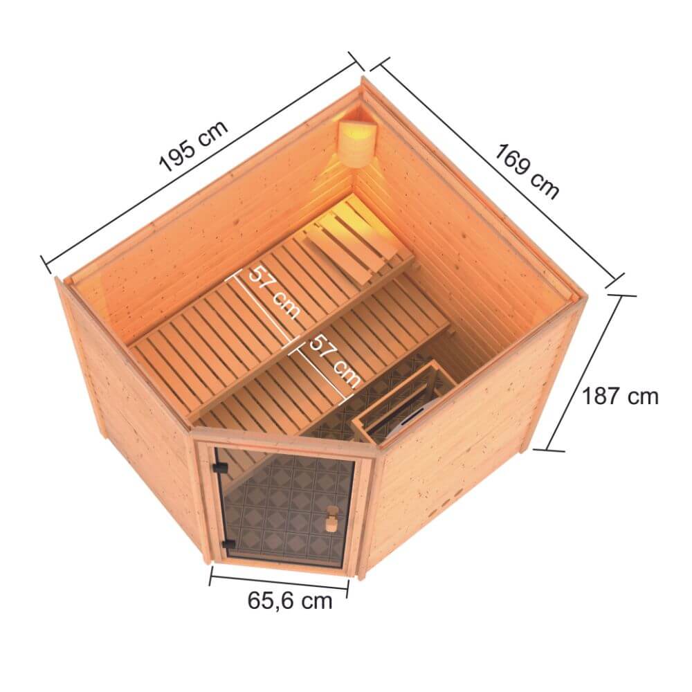 Diese Massivholzsauna aus 38 mm starken Massivholzbrettern aus hochwertiger nordischer Fichte wird im einfachen Steck-/Schraubsystem errichtet. Durch die hochwertige Saunatür mit Eckeinstieg gelangen Sie nach erfolgter Montage in den Innenraum mit 185 cm x 159 cm. Hier empfangen Sie das mitgelieferte Ofenschutzgitter sowie 2 Liege/n. Auch bei unseren Massivholzsaunen im Steck-/Schraubsystem sind alle 4 Seitenwände aus massivem Fichtenholz erstellt, sodass wir hier keinen Einsatz von Hartfaserplatten oder ähnlichem haben (außer im Dachbereich). Die Sauna mit den 4 Sichtseiten können so beliebig im Raum platziert werden. Die Dachplatten bestehen aus 57 mm Elementbauweise mit einer Mineralwolldämmung.