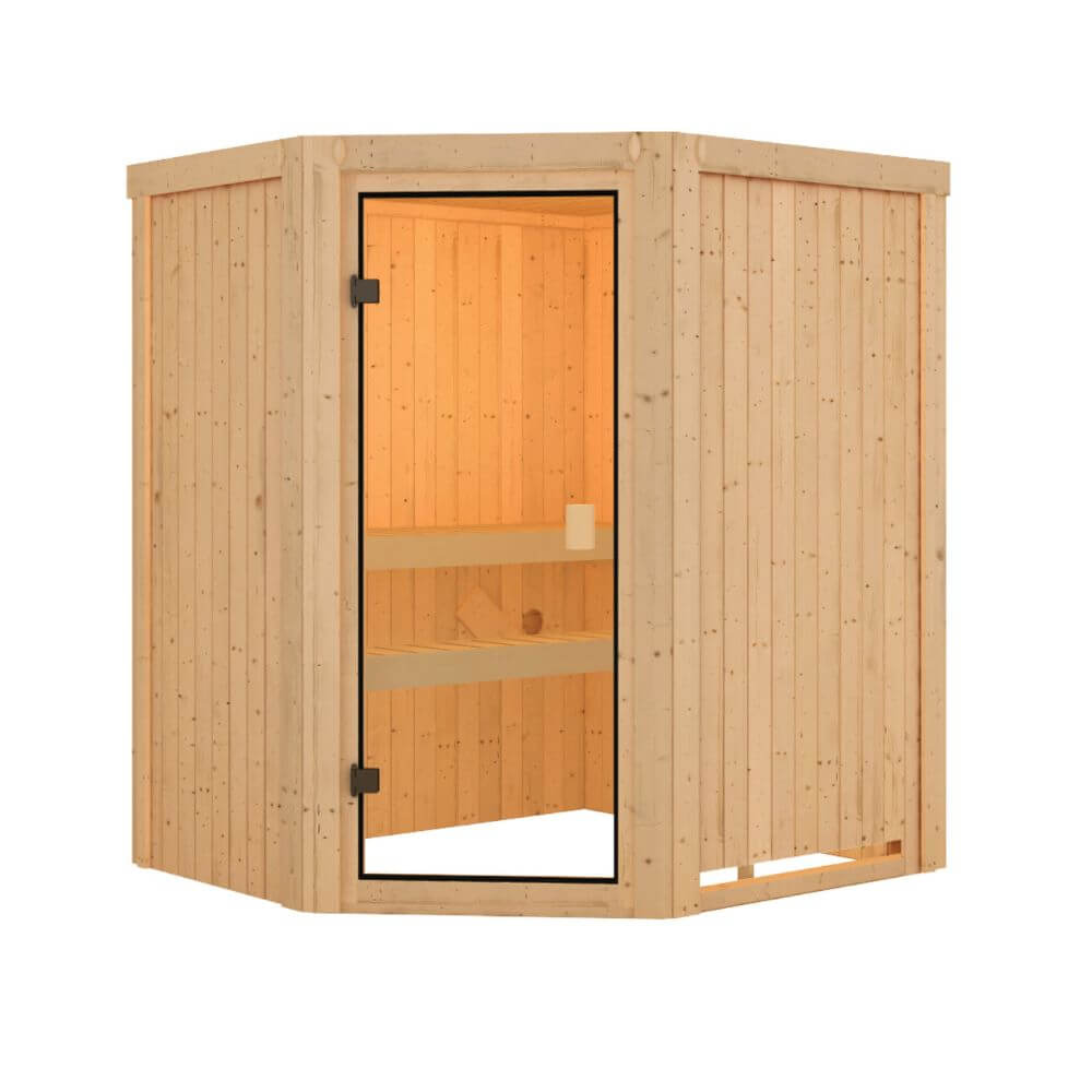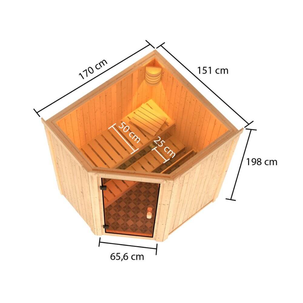 Sparen ohne Qualitätsverlust – mit der System-Sauna Faurin aus 68mm nordischem Fichtenholz. Die Sauna wird mit der einfachen Elementbauweise montiert und ermöglicht so eine schnelle Montage. Mit einem Außenmaß von 170 x 151 x 198 cm (B/T/H) bietet dieses Saunamodell ausreichend Platz zum gemeinsamen Entspannen und Wohlfühlen. Für Sitz – oder Liegemöglichkeiten in der Sauna sorgen die 2 Saunabänke aus nordischem Fichtenholz. Erweitern können Sie die Innenausstattung mit unserem optional erhältlichen Zubehör. Mit dem 3er-SET der Kopfstütze-Premium können Sie nicht nur Ihren Kopf optimal stützen. Durch zusammenschieben zweier Kopfstützen schaffen Sie sich eine Venenstütze für die Beine. Bei Problemen der Atemwege können Ihnen unsere Salzkristalle helfen. Durch anbringen einer Salzkristall-Leuchte oder einer Salzkristall Vital Sole schaffen Sie eine wertvolle, salzhaltige Luft während des Saunierens. Diese ermöglicht eine schonende und wirkungsvolle Behandlung der Atemwege und kann Entzündungen vorbeugen. Erwärmen können Sie die Luft im Saunainneren durch einen optional wählbaren 4,5kW-Saunaofen. Entscheiden Sie sich zwischen einem Ofen mit integrierter Steuerung, einem 4,5kW-Ofen mit externer Steuerung „Easy“ oder unserem Alleskönner, dem 4,5kW Bio-Kombiofen. Mit diesem ist neben dem normalen finnischen Saunieren auch eine Dampfsauna möglich. So können Sie die Sauna ganz leicht auf Ihre Wünsche und Bedürfnisse ausstatten. Vor Verbrennungen am heißen Saunaofen schützt Sie das, im Lieferumfang enthaltene, Ofenschutzgitter. Durch eine bronzierte Ganzglastür aus Einscheibensicherheitsglas mit Magnetverschlusstechnik wird die Saunakabine verschlossen und das Entweichen der Wärme wird verhindert. Richten Sie sich Ihre Saunalandschaft ein, mit der Massivholz-Sauna Faurin und das zu einem fairen Preis ohne Qualitätsverlust.