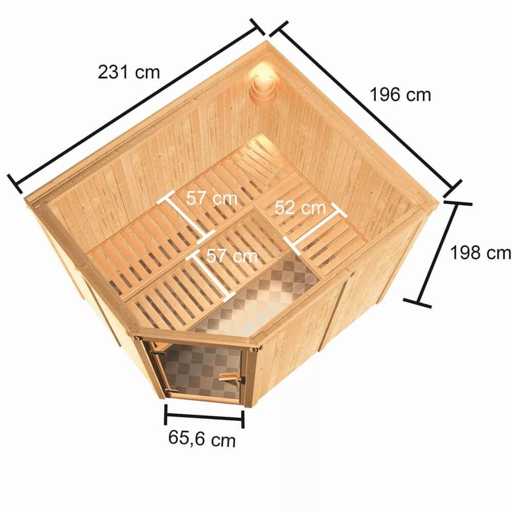 Sparen ohne Qualitätsverlust – mit der System-Sauna Horna aus 68mm nordischem Fichtenholz.Die Sauna wird mit der einfachen Elementbauweise montiert und ermöglicht so eine schnelle Montage. Mit einem Außenmaß von 231 x 196 x 198 cm (B/T/H) bietet dieses Saunamodell ausreichend Platz zum gemeinsamen Entspannen und Wohlfühlen. Für Sitz – oder Liegemöglichkeiten in der Sauna sorgen die 3 Saunabänke aus nordischem Fichtenholz. Erweitern können Sie die Innenausstattung mit unserem optional erhältlichen Zubehör. Mit dem 3er-SET der Kopfstütze-Premium können Sie nicht nur Ihren Kopf optimal stützen. Durch zusammenschieben zweier Kopfstützen schaffen Sie sich eine Venenstütze für die Beine. Bei Problemen der Atemwege können Ihnen unsere Salzkristalle helfen. Durch anbringen einer Salzkristall-Leuchte oder einer Salzkristall Vital Sole schaffen Sie eine wertvolle, salzhaltige Luft während des Saunierens. Diese ermöglicht eine schonende und wirkungsvolle Behandlung der Atemwege und kann Entzündungen vorbeugen. Erwärmen können Sie die Luft im Saunainneren durch einen optional wählbaren 9kW-Saunaofen. Entscheiden Sie sich zwischen einem Ofen mit integrierter Steuerung, einem 9kW-Ofen mit externer Steuerung „Easy“ oder unserem Alleskönner, dem 9kW Bio-Kombiofen. Mit diesem ist neben dem normalen finnischen Saunieren auch eine Dampfsauna möglich. So können Sie die Sauna ganz leicht auf Ihre Wünsche und Bedürfnisse ausstatten. Vor Verbrennungen am heißen Saunaofen schützt Sie das, im Lieferumfang enthaltene, Ofenschutzgitter. Durch eine bronzierte Ganzglastür aus Einscheibensicherheitsglas mit Magnetverschlusstechnik wird die Saunakabine verschlossen und das Entweichen der Wärme wird verhindert. Richten Sie sich Ihre Saunalandschaft ein, mit der Massivholz-Sauna Horna und das zu einem fairen Preis ohne Qualitätsverlust.