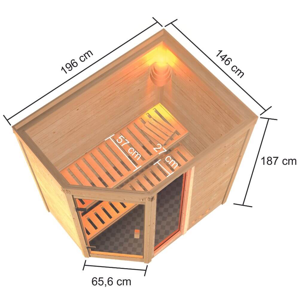 Was eignet sich für einen bislang ungenutzten Kellerraum besser, als eine eigene Sauna zum Entspannen und Wohlfühlen? Die Sauna Sauna Jada hat ein Außenmaß von 196 x 146 cm und ist, aufgrund seiner geringen Höhe von 187 cm, ideal auch für Räume mit einer niedrigen Deckenhöhe geeignet. Die Massivholzsauna besteht aus 38mm starken Wandbohlen aus nordischer Fichte, welche im einfachen Steck- und Schraubsystem montiert werden. Durch den Eckeinstieg und die besondere, fünfeckige Form, sorgt die Sauna für ein Highlight in Ihrer Wellness-Oase. Mit einem optional wählbaren Dachkranz inkl. 3 LED-Spots, können Sie die Sauna von außen beleuchten und sie so gekonnt in Szene setzen. In den Innenraum gelangen Sie durch eine bronzierte Ganzglastür aus Einscheibensicherheitsglas. Damit beim Saunieren keine Wärme entweichen kann, wird die Tür durch eine Magnetverschlusstechnik geschlossen gehalten. Auf den, im Lieferumfang enthaltenen, Liegen können Sie den Saunagang so richtig genießen. Verschönern Sie das Ambiente in Ihrer Sauna und sorgen Sie für die größtmögliche Erholung mit unserem optional erhältlichen Zubehör. Eine Saunalampe Classic in der Ecke, eine ergonomische Kopfstütze für die perfekte Liegeposition oder eine Salzkristall Vital Sole für freies Atmen macht Ihren Saunagang zu einem perfekten Erlebnis. Entspannen Sie nach einem stressigen Arbeitstag und schöpfen Sie neue Kraft aus der angenehmen Wärme auf Ihrer Haut. Heizen Sie den Innenraum mit einem optional erhältlichen, klassischen 9kW-Ofen. Dieser sorgt aufgrund seiner höheren Leistung für höhere Temperaturen und für ein angenehmes Klima im Innenraum. Der Saunaofen ist in einer Variante mit integrierter Steuerung, einer mit externer Steuerung und als Bio-Kombiofen erhältlich. Nutzen Sie Ihren Kellerraum zur Entspannung und verwandeln Sie ihn in eine Wellness-Oase mit der Massivholzsauna Sauna Jada.