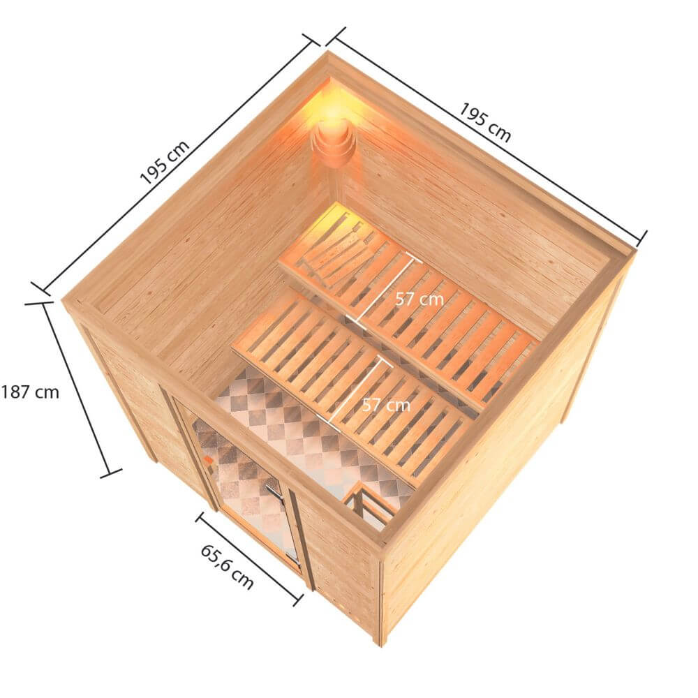Was eignet sich für einen bislang ungenutzten Kellerraum besser, als eine eigene Sauna zum Entspannen und Wohlfühlen? Die Sauna Jara hat ein Außenmaß von 195 x 195 cm und ist, aufgrund seiner geringen Höhe von 187 cm, ideal auch für Räume mit einer niedrigen Deckenhöhe geeignet. Die Massivholzsauna besteht aus 38mm starken Wandbohlen aus nordischer Fichte, welche im einfachen Steck- und Schraubsystem montiert werden. Durch den Fronteinstieg und die schlichte, rechteckige Form passt sie sich jeder Umgebung mühelos an. Mit einem optional wählbaren Dachkranz inkl. 3 LED-Spots, können Sie die Sauna von außen beleuchten und sie so gekonnt in Szene setzen. In den Innenraum gelangen Sie durch eine bronzierte Ganzglastür aus Einscheibensicherheitsglas. Damit beim Saunieren keine Wärme entweichen kann, wird die Tür durch eine Magnetverschlusstechnik geschlossen gehalten. Auf den, im Lieferumfang enthaltenen, Liegen können Sie den Saunagang so richtig genießen. Verschönern Sie das Ambiente in Ihrer Sauna und sorgen Sie für die größtmögliche Erholung mit unserem optional erhältlichen Zubehör. Eine Saunalampe Classic in der Ecke, eine ergonomische Kopfstütze für die perfekte Liegeposition oder eine Salzkristall Vital Sole für freies Atmen macht Ihren Saunagang zu einem perfekten Erlebnis. Entspannen Sie nach einem stressigen Arbeitstag und schöpfen Sie neue Kraft aus der angenehmen Wärme auf Ihrer Haut. Heizen Sie den Innenraum mit einem optional erhältlichen, klassischen4,5kW-Ofen. Dieser sorgt aufgrund seiner höheren Leistung für höhere Temperaturen und für ein angenehmes Klima im Innenraum. Der Saunaofen ist in einer Variante mit integrierter Steuerung, einer mit externer Steuerung und als Bio-Kombiofen erhältlich. Nutzen Sie Ihren Kellerraum zur Entspannung und verwandeln Sie ihn in eine Wellness-Oase mit der Massivholzsauna Sauna Jara.
