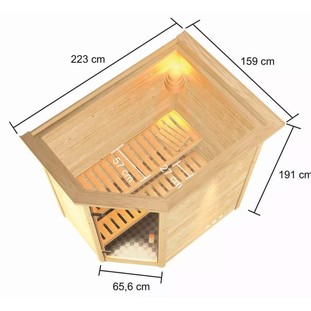 Was eignet sich für einen bislang ungenutzten Kellerraum besser, als eine eigene Sauna zum Entspannen und Wohlfühlen? Die Sauna Jella hat ein Außenmaß von 195 x 145 cm und ist, aufgrund seiner geringen Höhe von 187 cm, ideal auch für Räume mit einer niedrigen Deckenhöhe geeignet. Die Massivholzsauna besteht aus 38mm starken Wandbohlen aus nordischer Fichte, welche im einfachen Steck- und Schraubsystem montiert werden. Durch den Eckeinstieg und die besondere, fünfeckige Form, sorgt die Sauna für ein Highlight in Ihrer Wellness-Oase. Mit einem optional wählbaren Dachkranz inkl. 3 LED-Spots, können Sie die Sauna von außen beleuchten und sie so gekonnt in Szene setzen. In den Innenraum gelangen Sie durch eine bronzierte Ganzglastür aus Einscheibensicherheitsglas. Damit beim Saunieren keine Wärme entweichen kann, wird die Tür durch eine Magnetverschlusstechnik geschlossen gehalten. Auf den, im Lieferumfang enthaltenen, Saunaliegen können Sie den Saunagang so richtig genießen. Entspannen Sie nach einem stressigen Arbeitstag und schöpfen Sie neue Kraft aus der angenehmen Wärme auf Ihrer Haut. Heizen Sie den Innenraum mit einem optional erhältlichen, steckerfertigen 3,6kW Ofen. Dieser hat den Vorteil, dass er einfach an eine hausübliche 240Volt Steckdose angeschlossen werden kann und so keine Montage- oder Umbaukosten erfordert. Oder wählen Sie unseren klassischen 4,5kW-Ofen. Dieser schafft, aufgrund der höheren Leistung, eine höhere maximale Temperatur. Beide Öfen sind in drei verschiedenen Varianten erhältlich. Nutzen Sie Ihren Kellerraum zur Entspannung und verwandeln Sie ihn in eine Wellness-Oase mit der Massivholzsauna Sauna Jella.