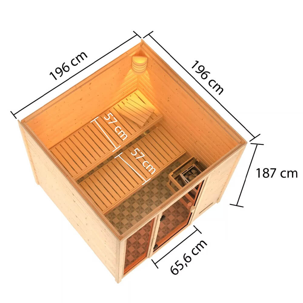 Was eignet sich für einen bislang ungenutzten Kellerraum besser, als eine eigene Sauna zum Entspannen und Wohlfühlen? Die Sauna Jutta hat ein Außenmaß von 196 x 196 cm und ist, aufgrund seiner geringen Höhe von 187 cm, ideal auch für Räume mit einer niedrigen Deckenhöhe geeignet. Die Massivholzsauna besteht aus 38mm starken Wandbohlen aus nordischer Fichte, welche im einfachen Steck- und Schraubsystem montiert werden. Durch den Fronteinstieg und die schlichte, rechteckige Form passt sie sich jeder Umgebung mühelos an. Mit einem optional wählbaren Dachkranz inkl. 3 LED-Spots, können Sie die Sauna von außen beleuchten und sie so gekonnt in Szene setzen. In den Innenraum gelangen Sie durch eine bronzierte Ganzglastür aus Einscheibensicherheitsglas. Damit beim Saunieren keine Wärme entweichen kann, wird die Tür durch eine Magnetverschlusstechnik geschlossen gehalten. Auf den, im Lieferumfang enthaltenen, Liegen können Sie den Saunagang so richtig genießen. Verschönern Sie das Ambiente in Ihrer Sauna und sorgen Sie für die größtmögliche Erholung mit unserem optional erhältlichen Zubehör. Eine Saunalampe Classic in der Ecke, eine ergonomische Kopfstütze für die perfekte Liegeposition oder eine Salzkristall Vital Sole für freies Atmen macht Ihren Saunagang zu einem perfekten Erlebnis. Entspannen Sie nach einem stressigen Arbeitstag und schöpfen Sie neue Kraft aus der angenehmen Wärme auf Ihrer Haut. Heizen Sie den Innenraum mit einem optional erhältlichen, klassischen 9kW-Ofen. Dieser sorgt aufgrund seiner höheren Leistung für höhere Temperaturen und für ein angenehmes Klima im Innenraum. Der Saunaofen ist in einer Variante mit integrierter Steuerung, einer mit externer Steuerung und als Bio-Kombiofen erhältlich. Nutzen Sie Ihren Kellerraum zur Entspannung und verwandeln Sie ihn in eine Wellness-Oase mit der Massivholzsauna Sauna Jutta.