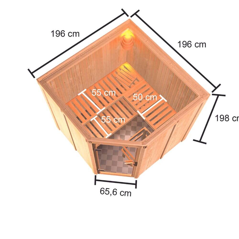 Sparen ohne Qualitätsverlust – mit der System-Sauna Kotka aus 68mm nordischem Fichtenholz. Die Sauna wird mit der einfachen Elementbauweise montiert und ermöglicht so eine schnelle Montage. Mit einem Außenmaß von 196 x 196 x 198 cm (B/T/H) bietet dieses Saunamodell ausreichend Platz zum gemeinsamen Entspannen und Wohlfühlen. Für Sitz – oder Liegemöglichkeiten in der Sauna sorgen die 3 Saunabänke aus nordischem Fichtenholz. Erweitern können Sie die Innenausstattung mit unserem optional erhältlichen Zubehör. Mit dem 3er-SET der Kopfstütze-Premium können Sie nicht nur Ihren Kopf optimal stützen. Durch zusammenschieben zweier Kopfstützen schaffen Sie sich eine Venenstütze für die Beine. Bei Problemen der Atemwege können Ihnen unsere Salzkristalle helfen. Durch anbringen einer Salzkristall-Leuchte oder einer Salzkristall Vital Sole schaffen Sie eine wertvolle, salzhaltige Luft während des Saunierens. Diese ermöglicht eine schonende und wirkungsvolle Behandlung der Atemwege und kann Entzündungen vorbeugen. Erwärmen können Sie die Luft im Saunainneren durch einen optional wählbaren 9kW-Saunaofen. Entscheiden Sie sich zwischen einem Ofen mit integrierter Steuerung, einem 9kW-Ofen mit externer Steuerung „Easy“ oder unserem Alleskönner, dem 9kW Bio-Kombiofen. Mit diesem ist neben dem normalen finnischen Saunieren auch eine Dampfsauna möglich. So können Sie die Sauna ganz leicht auf Ihre Wünsche und Bedürfnisse ausstatten. Vor Verbrennungen am heißen Saunaofen schützt Sie das, im Lieferumfang enthaltene, Ofenschutzgitter. Durch eine bronzierte Ganzglastür aus Einscheibensicherheitsglas mit Magnetverschlusstechnik wird die Saunakabine verschlossen und das Entweichen der Wärme wird verhindert. Richten Sie sich Ihre Saunalandschaft ein, mit der Massivholz-Sauna Kotka und das zu einem fairen Preis ohne Qualitätsverlust.