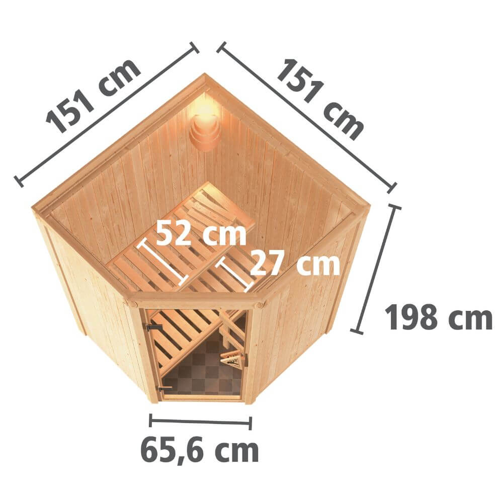 Sparen Sie wertvolle Energie mit der Systemsauna Larin. Eine 68mm starke Konstruktion, bestehend aus einer Rahmenkonstruktion mit 42mm starker Mineraldämmwolle und einer Verkleidung an der Sichtseite aus 12,5mm Spezial-Softline-Profilholz, hält die Wärme optimal im Saunainneren. Die Decke besteht aus einer 57mm starken Spezialplatte mit Mineraldämmwolle. Die Außenmaße ohne Dachkranz betragen 151 x 151 x 198cm (B/T/H). Die Sauna verfügt über 2 Saunabänke aus Espenholz zum Entspannen und Wohlfühlen. Mit einem optional erhältlichen 4,5kW-Saunaofen bringen Sie das Innere schnell auf Temperatur. Bei dem Ofen können Sie zwischen einer Variante mit integrierter Steuerung, einer Variante mit externer Steuerung oder einem 4,5kW Bio-Kombiofen wählen. So ist garantiert für jeden das Richtige dabei. Durch einen optionalen Dachkranz inkl. drei LED-Spots können Sie Ihre Sauna von außen beleuchten und sie so perfekt in Szene setzen. In den Innenraum gelangen Sie durch eine Saunatür. Hier können Sie sich zwischen vier möglichen Varianten entscheiden. Egal ob klassisch mit bronziertem Glas, modern mit graphitfarbenem Glas, schlicht mit klarem Türglas oder passend mit einer energiesparenden, wärmegedämmten Holztür mit klarem Isolierglas. Durch die vorgefertigten Wand und Deckenelemente wird Ihnen ein einfacher Aufbau ermöglicht. Passen Sie die Sauna auf Ihre Bedürfnisse an mit unserem optional erhältlichen Zubehör. Eine ergonomische Kopfstütze für den optimalen Liegekomfort, eine ergonomische Rückenlehne zur perfekten Entspannung oder eine Saunaleuchte modern für das richtige Ambiente. Genießen Sie die Ruhe nach einem anstrengenden Arbeitstag bei einem ausgiebigen Saunagang und erholen Sie sich vom Alltag. Verringern Sie den Energieverbrauch beim Saunieren mit der 68mm Systemsauna Larin.