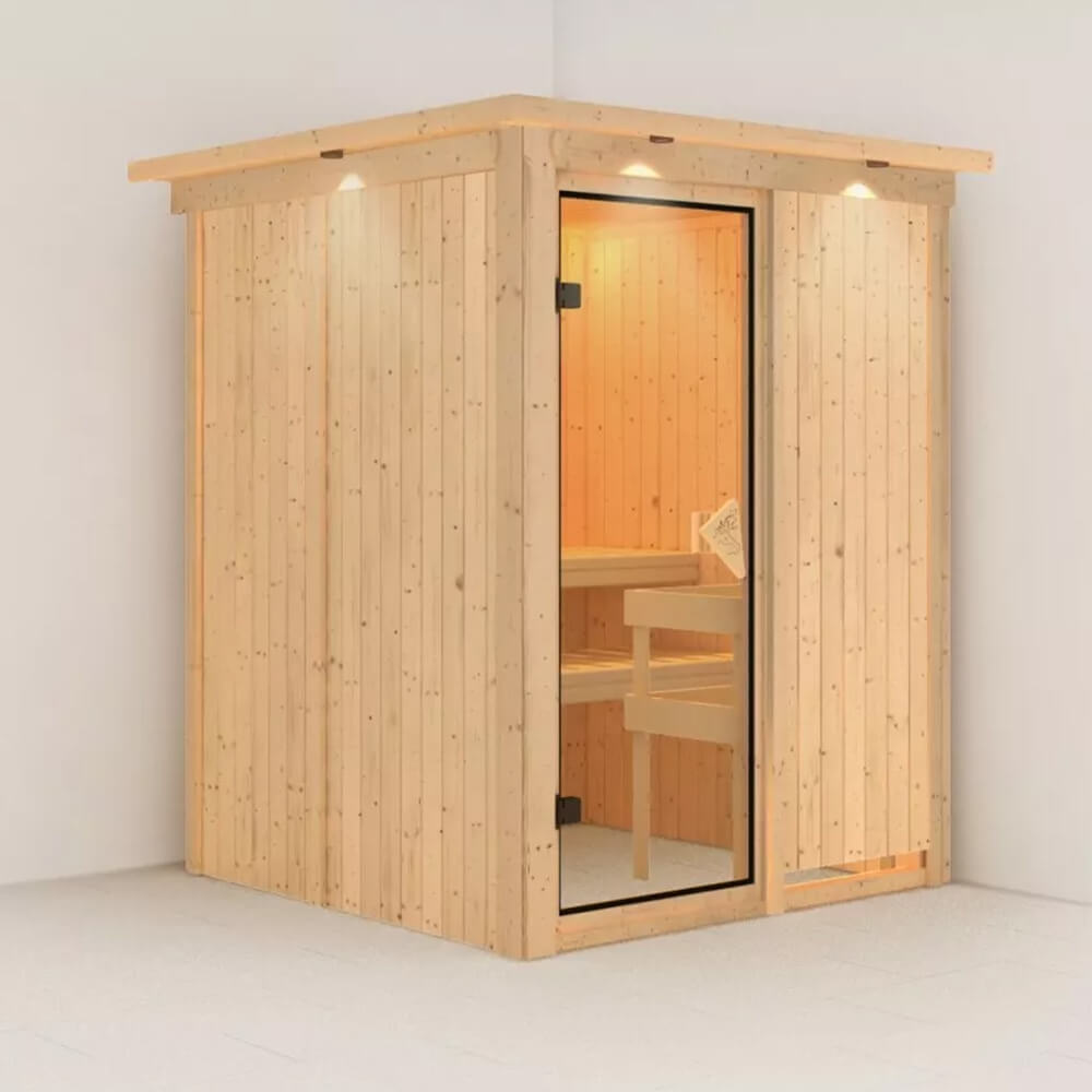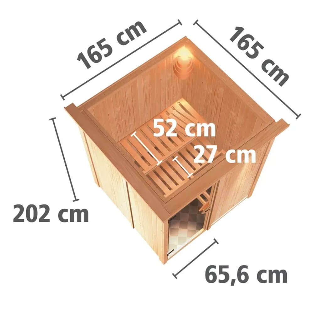 Das volle Saunaerlebnis genießen und dennoch Energie sparen. Dies ist möglich mit unserenr 68mm Systemsauna Minja und dem steckerfertigen 3,6kW-Saunaofen. Durch die vormontierten Wandelemente kann die Sauna schnell und einfach montiert werden. Die 68mm starken Elemente bestehen aus einer Rahmenkonstruktion, welche an der Sichtseite mit 12,5mm starkem Spezial-Softline-Profilholz verstärkt sind. Diese Konstruktion bietet eine ideale Isolierung und hält die Wärme perfekt im Innenraum. Optional ist die Sauna Minja mit einem Dachkranz inkl. drei LED-Spots erhältlich. Diese sorgen nicht nur für ein schönes Ambiente im Außenbereich der Sauna, sondern setzen diese auch noch gekonnt in Szene. Die Außenmaße betragen 151 x 151 x 198cm (B/T/H). In den großen Innenraum der Sauna gelangen Sie durch eine Saunatür. Hier haben Sie die Wahl aus vier Varianten und das ganz ohne Mehrkosten. Egal ob in der wärmegedämmten, energiesparenden Version, der klaren Ganzglastür, der Version mit bronzierte Ganzglastür oder der modernen graphitfarbenen Türversion. Hier ist garantiert für jeden Geschmack das Richtige dabei. Um sich im Saunainneren perfekt erholen zu können, werden hier2 Saunaliegen aus massivem Espenholz montiert. Das Holz ist besonders weich und nimmt die Wärme nicht so stark an. Dies ermöglicht ein angenehmes Sitz- und Liegegefühl. Bei dem steckerfertigen Saunaofen können Sie zwischen drei Varianten wählen. Einer mit integrierter Steuerung, einer mit externem Steuergerät „Easy“ und einem 3,6kW Bio-Kombi-Ofen. Das Besondere an diesem Saunaofen ist aber nicht seine Variantenvielfallt, sondern der Anschluss. Der Ofen wird mithilfe eines Steckers zur Inbetriebnahme an eine hausübliche 230Volt-Steckdose angeschlossen. Da hierfür kein Fachmann erforderlich ist, entfallen die Kosten für einen Elektriker und einen Umbau auf einen 400 Volt-Anschluss. Genießen Sie das volle Saunaerlebnis und sparen zusätzlich Energie mit der 68mm Plug & Play Sauna Minja.
