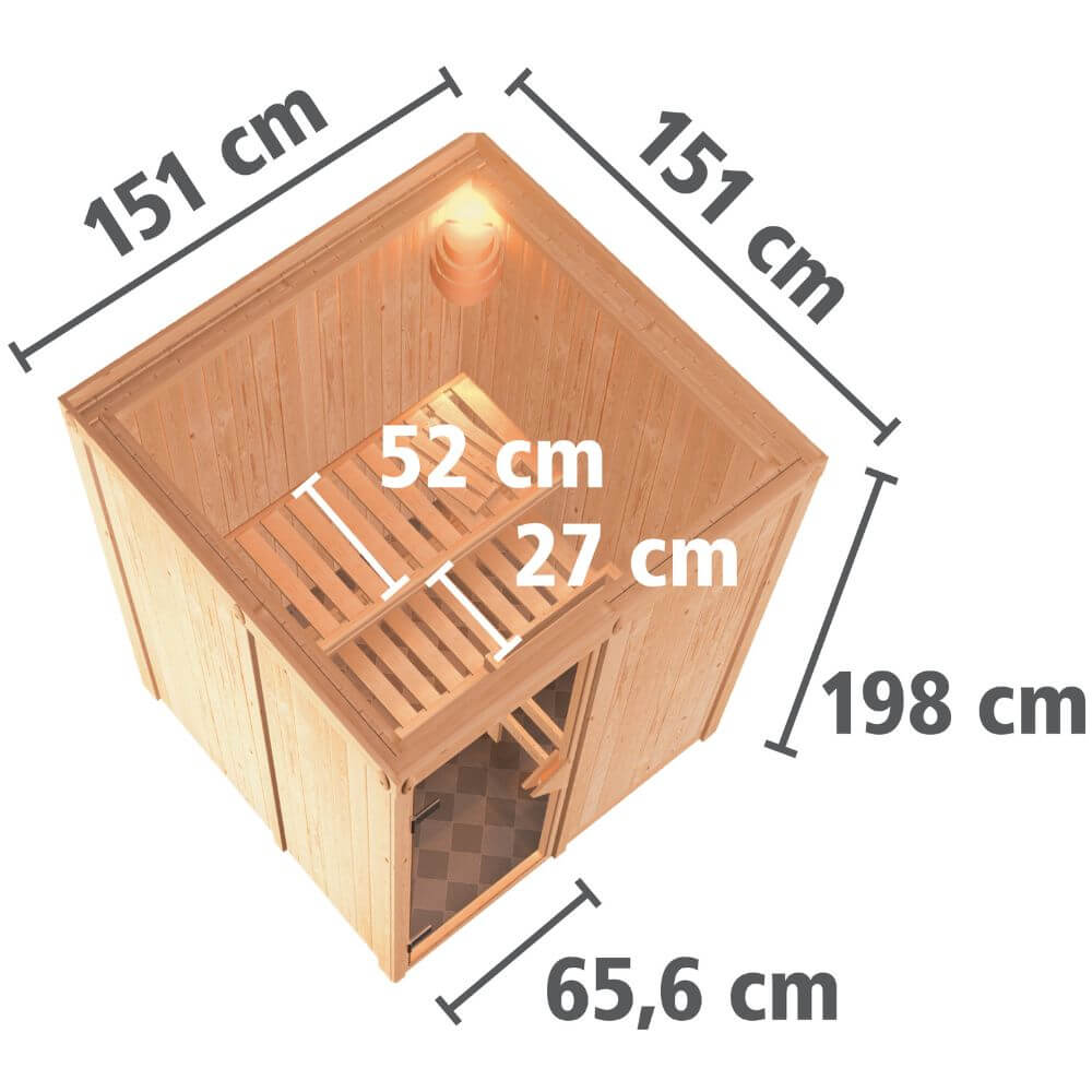 Sparen Sie wertvolle Energie mit der Systemsauna Norin. Eine 68mm starke Konstruktion, bestehend aus einer Rahmenkonstruktion mit 42mm starker Mineraldämmwolle und einer Verkleidung an der Sichtseite aus 12,5mm Spezial-Softline-Profilholz, hält die Wärme optimal im Saunainneren. Die Decke besteht aus einer 57mm starken Spezialplatte mit Mineraldämmwolle. Die Außenmaße ohne Dachkranz betragen 151 x 151 x 198cm (B/T/H). Die Sauna verfügt über 2 Saunabänke aus Espenholz zum Entspannen und Wohlfühlen. Mit einem optional erhältlichen 4,5kW-Saunaofen bringen Sie das Innere schnell auf Temperatur. Bei dem Ofen können Sie zwischen einer Variante mit integrierter Steuerung, einer Variante mit externer Steuerung oder einem 4,5kW Bio-Kombiofen wählen. So ist garantiert für jeden das Richtige dabei. Durch einen optionalen Dachkranz inkl. drei LED-Spots können Sie Ihre Sauna von außen beleuchten und sie so perfekt in Szene setzen. In den Innenraum gelangen Sie durch eine Saunatür. Hier können Sie sich zwischen vier möglichen Varianten entscheiden. Egal ob klassisch mit bronziertem Glas, modern mit graphitfarbenem Glas, schlicht mit klarem Türglas oder passend mit einer energiesparenden, wärmegedämmten Holztür mit klarem Isolierglas. Durch die vorgefertigten Wand und Deckenelemente wird Ihnen ein einfacher Aufbau ermöglicht. Passen Sie die Sauna auf Ihre Bedürfnisse an mit unserem optional erhältlichen Zubehör. Eine ergonomische Kopfstütze für den optimalen Liegekomfort, eine ergonomische Rückenlehne zur perfekten Entspannung oder eine Saunaleuchte modern für das richtige Ambiente. Genießen Sie die Ruhe nach einem anstrengenden Arbeitstag bei einem ausgiebigen Saunagang und erholen Sie sich vom Alltag. Verringern Sie den Energieverbrauch beim Saunieren mit der 68mm Systemsauna Norin.