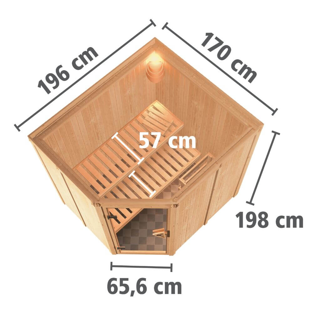 Sparen Sie wertvolle Energie mit der Systemsauna Siirin. Eine 68mm starke Konstruktion, bestehend aus einer Rahmenkonstruktion mit 42mm starker Mineraldämmwolle und einer Verkleidung an der Sichtseite aus 12,5mm Spezial-Softline-Profilholz, hält die Wärme optimal im Saunainneren. Die Decke besteht aus einer 57mm starken Spezialplatte mit Mineraldämmwolle. Die Außenmaße ohne Dachkranz betragen 196 x 170 x 198cm (B/T/H). Die Sauna verfügt über 2 Saunabänke aus Espenholz zum Entspannen und Wohlfühlen. Mit einem optional erhältlichen 4,5kW-Saunaofen bringen Sie das Innere schnell auf Temperatur. Bei dem Ofen können Sie zwischen einer Variante mit integrierter Steuerung, einer Variante mit externer Steuerung oder einem 4,5kW Bio-Kombiofen wählen. So ist garantiert für jeden das Richtige dabei. Durch einen optionalen Dachkranz inkl. drei LED-Spots können Sie Ihre Sauna von außen beleuchten und sie so perfekt in Szene setzen. In den Innenraum gelangen Sie durch eine Saunatür. Hier können Sie sich zwischen vier möglichen Varianten entscheiden. Egal ob klassisch mit bronziertem Glas, modern mit graphitfarbenem Glas, schlicht mit klarem Türglas oder passend mit einer energiesparenden, wärmegedämmten Holztür mit klarem Isolierglas. Durch die vorgefertigten Wand und Deckenelemente wird Ihnen ein einfacher Aufbau ermöglicht. Passen Sie die Sauna auf Ihre Bedürfnisse an mit unserem optional erhältlichen Zubehör. Eine ergonomische Kopfstütze für den optimalen Liegekomfort, eine ergonomische Rückenlehne zur perfekten Entspannung oder eine Saunaleuchte modern für das richtige Ambiente. Genießen Sie die Ruhe nach einem anstrengenden Arbeitstag bei einem ausgiebigen Saunagang und erholen Sie sich vom Alltag. Verringern Sie den Energieverbrauch beim Saunieren mit der 68mm Systemsauna Siirin.