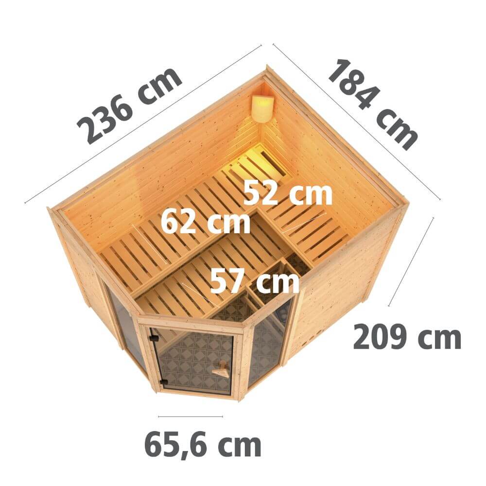 Ein Ort der Ruhe und Entspannung in den eigenen Vier Wänden. Nach einem stressigen Tag die Seele baumeln lassen und sich von der wohligen Wärme in einer Sauna verwöhnen ohne das Haus verlassen zu müssen. Dies ist möglich mit unserer 40mm Massivholzsauna Sinai 3. Die stabile Konstruktion mit 40mm Bohlen aus nordischem Fichtenholz wird im einfachen Steck-/ Schraubsystem montiert. Durch die massiven Vollholzwände wird im Saunainneren ein ideales Raumklima nach finnischem Vorbild geschaffen. Ein optional wählbarer Dachkranz inkl. 3 LED-Spots setzt die Sauna gekonnt in Szene. Das Innere der Sauna erreichen Sie durch eine bronzierte Ganzglastür aus Einscheibensicherheitsglas mit Karibu-Türgriff. Durch die Tür und die beiden bronzierten Fenster gelangt Licht in den Innenraum und sorgt durch die bronzierten Gläser für ein warmes Ambiente. Mit einem Außenmaß von 236 x 184 x 209 cm (H/B/T) besitzt die Sauna Sinai 3 die ideale Größe zum Entspannen und Wohlfühlen. Erweitern Sie Ihre Möglichkeiten mit dem optional erhältlichen 9kW-Bio-Kombiofen. Neben einer klassischen finnischen Sauna haben Sie hier die Möglichkeit einer Kräuterdampf-Kur, einem Dampfbad und einer Familiensauna. So wird es zu einem Saunaerlebnis für die ganze Familie. Lassen Sie sich von der wohltuenden Wirkung des Saunabadens überzeugen. Bei regelmäßiger Anwendung fühlen Sie sich nicht nur deutlich entspannter. Zusätzlich wirkt es sich positiv auf den Stoffwechsel aus, verfeinert das Hautbild und unterstützt den Stressabbau. Um ein besonderes Sauna-Gefühl zu schaffen, wird die Sauna mit 3 Saunaliegen und einer Kopfstütze ausgestattet. Durch eine extra breite Saunaliege von 62cm Breite wird Ihnen ein besonders angenehmer Liegekomfort geboten. Ein Ofenschutzgitter schützt Sie vor Verbrennungen durch den Saunaofen. Mit einer optional erhältlichen Salzkristall Vital Sole oder der Salzkristall-Leuchte können Sie Ihre Atemwege befreien und wieder tief ein- und ausatmen. Genießen Sie die zahlreichen Vorteile des Saunieren und schaffe Sie einen Ort der Ruhe mit der MassivholzsaunaSinai 3.
