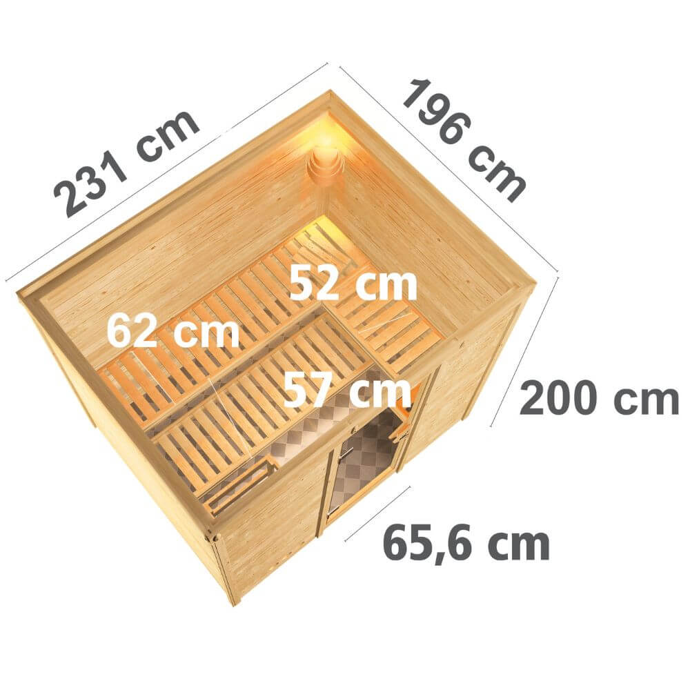 Sparen Sie wertvolle Energie mit der Systemsauna Sodin. Eine 68mm starke Konstruktion, bestehend aus einer Rahmenkonstruktion mit 42mm starker Mineraldämmwolle und einer Verkleidung an der Sichtseite aus 12,5mm Spezial-Softline-Profilholz, hält die Wärme optimal im Saunainneren. Die Decke besteht aus einer 57mm starken Spezialplatte mit Mineraldämmwolle. Die Außenmaße ohne Dachkranz betragen 196 x 170 x 198cm (B/T/H). Die Sauna verfügt über 2 Saunabänke aus Espenholz zum Entspannen und Wohlfühlen. Mit einem optional erhältlichen 4,5kW-Saunaofen bringen Sie das Innere schnell auf Temperatur. Bei dem Ofen können Sie zwischen einer Variante mit integrierter Steuerung, einer Variante mit externer Steuerung oder einem 4,5kW Bio-Kombiofen wählen. So ist garantiert für jeden das Richtige dabei. Durch einen optionalen Dachkranz inkl. drei LED-Spots können Sie Ihre Sauna von außen beleuchten und sie so perfekt in Szene setzen. In den Innenraum gelangen Sie durch eine Saunatür. Hier können Sie sich zwischen vier möglichen Varianten entscheiden. Egal ob klassisch mit bronziertem Glas, modern mit graphitfarbenem Glas, schlicht mit klarem Türglas oder passend mit einer energiesparenden, wärmegedämmten Holztür mit klarem Isolierglas. Durch die vorgefertigten Wand und Deckenelemente wird Ihnen ein einfacher Aufbau ermöglicht. Passen Sie die Sauna auf Ihre Bedürfnisse an mit unserem optional erhältlichen Zubehör. Eine ergonomische Kopfstütze für den optimalen Liegekomfort, eine ergonomische Rückenlehne zur perfekten Entspannung oder eine Saunaleuchte modern für das richtige Ambiente. Genießen Sie die Ruhe nach einem anstrengenden Arbeitstag bei einem ausgiebigen Saunagang und erholen Sie sich vom Alltag. Verringern Sie den Energieverbrauch beim Saunieren mit der 68mm Systemsauna Sodin.