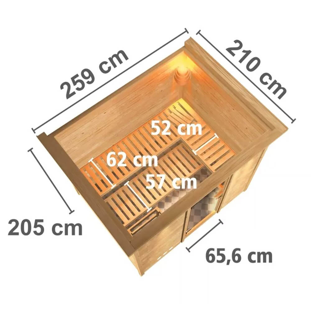 Ein Ort der Ruhe und Entspannung in den eigenen Vier Wänden. Nach einem stressigen Tag die Seele baumeln lassen und sich von der wohligen Wärme in einer Sauna verwöhnen ohne das Haus verlassen zu müssen. Dies ist möglich mit unserer 40mm Massivholzsauna Sonara. Die stabile Konstruktion mit 40mm Bohlen aus nordischem Fichtenholz wird im einfachen Steck-/ Schraubsystem montiert. Durch die massiven Vollholzwände wird im Saunainneren ein ideales Raumklima nach finnischem Vorbild geschaffen. Ein optional wählbarer Dachkranz inkl. 3 LED-Spots setzt die Sauna gekonnt in Szene. Wählen Sie eine von vier möglichen Türvarianten und passen Sie Ihre Sauna den eigenen Vorstellungen optimal an. Ob energiesparend mit einer Holztür mit Isolierglas, klassisch mit einer bronzierten Ganzglastür, modern mit einer Ganzglastür in graphitfarben oder schlicht mit einer klaren Ganzglastür. Hier ist garantiert das Richtige für Sie dabei. Mit einem Außenmaß von 236 x 184 x 209 cm (B/T/H) besitzt die Sauna Sonara die ideale Größe zum Entspannen und Wohlfühlen. Erweitern Sie Ihre Möglichkeiten mit dem optional erhältlichen 9kW-Bio-Kombiofen. Neben einer klassischen finnischen Sauna haben Sie hier die Möglichkeit einer Kräuterdampf-Kur, einem Dampfbad und einer Familiensauna. So wird es zu einem Saunaerlebnis für die ganze Familie. Lassen Sie sich von der wohltuenden Wirkung des Saunabadens überzeugen. Bei regelmäßiger Anwendung fühlen Sie sich nicht nur deutlich entspannter. Zusätzlich wirkt es sich positiv auf den Stoffwechsel aus, verfeinert das Hautbild und unterstützt den Stressabbau. Um ein besonderes Sauna-Gefühl zu schaffen, wird die Sauna mit Saunaliegen und einer Kopfstütze ausgestattet. Durch eine extra breite Saunaliege von 62cm Breite wird Ihnen ein besonders angenehmer Liegekomfort geboten. Ein Ofenschutzgitter schützt Sie vor Verbrennungen durch den Saunaofen. Mit einer optional erhältlichen Salzkristall Vital Sole oder der Salzkristall-Leuchte können Sie Ihre Atemwege befreien und wieder tief ein- und ausatmen. Genießen Sie die zahlreichen Vorteile des Saunieren und schaffe Sie einen Ort der Ruhe mit der Massivholzsauna Sonara.