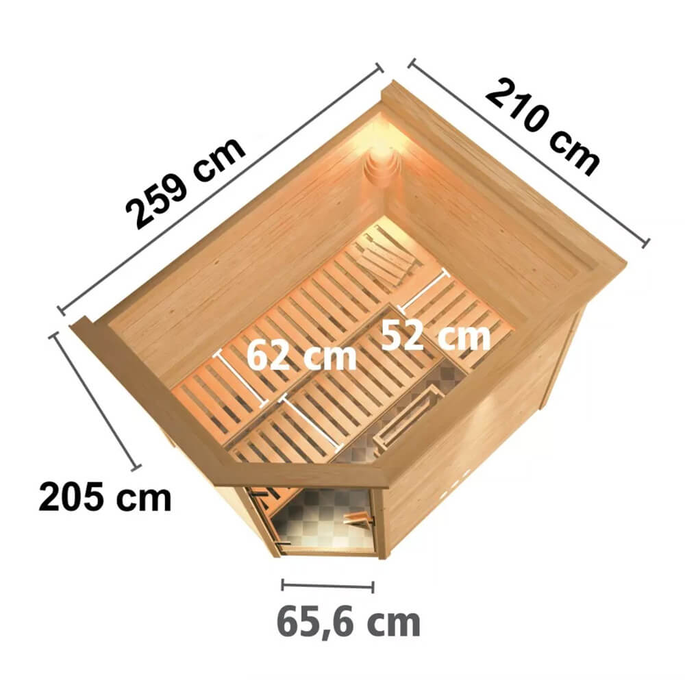 Ein Ort der Ruhe und Entspannung in den eigenen Vier Wänden. Nach einem stressigen Tag die Seele baumeln lassen und sich von der wohligen Wärme in einer Sauna verwöhnen ohne das Haus verlassen zu müssen. Dies ist möglich mit unserer 40mm Massivholzsauna Tanami. Die stabile Konstruktion mit 40mm Bohlen aus nordischem Fichtenholz wird im einfachen Steck-/ Schraubsystem montiert. Durch die massiven Vollholzwände wird im Saunainneren ein ideales Raumklima nach finnischem Vorbild geschaffen. Ein optional wählbarer Dachkranz inkl. 3 LED-Spots setzt die Sauna gekonnt in Szene. Wählen Sie eine von vier möglichen Türvarianten und passen Sie Ihre Sauna den eigenen Vorstellungen optimal an. Ob energiesparend mit einer Holztür mit Isolierglas, klassisch mit einer bronzierten Ganzglastür, modern mit einer Ganzglastür in graphitfarben oder schlicht mit einer klaren Ganzglastür. Hier ist garantiert das Richtige für Sie dabei. Mit einem Außenmaß von 231 x 196 x 200 cm (B/T/H) besitzt die Sauna Tanami die ideale Größe zum Entspannen und Wohlfühlen. Erweitern Sie Ihre Möglichkeiten mit dem optional erhältlichen 9kW-Bio-Kombiofen. Neben einer klassischen finnischen Sauna haben Sie hier die Möglichkeit einer Kräuterdampf-Kur, einem Dampfbad und einer Familiensauna. So wird es zu einem Saunaerlebnis für die ganze Familie. Lassen Sie sich von der wohltuenden Wirkung des Saunabadens überzeugen. Bei regelmäßiger Anwendung fühlen Sie sich nicht nur deutlich entspannter. Zusätzlich wirkt es sich positiv auf den Stoffwechsel aus, verfeinert das Hautbild und unterstützt den Stressabbau. Um ein besonderes Sauna-Gefühl zu schaffen, wird die Sauna mit Saunaliegen und einer Kopfstütze ausgestattet. Durch eine extra breite Saunaliege von 62cm Breite wird Ihnen ein besonders angenehmer Liegekomfort geboten. Ein Ofenschutzgitter schützt Sie vor Verbrennungen durch den Saunaofen. Mit einer optional erhältlichen Salzkristall Vital Sole oder der Salzkristall-Leuchte können Sie Ihre Atemwege befreien und wieder tief ein- und ausatmen. Genießen Sie die zahlreichen Vorteile des Saunieren und schaffe Sie einen Ort der Ruhe mit der Massivholzsauna Tanami.