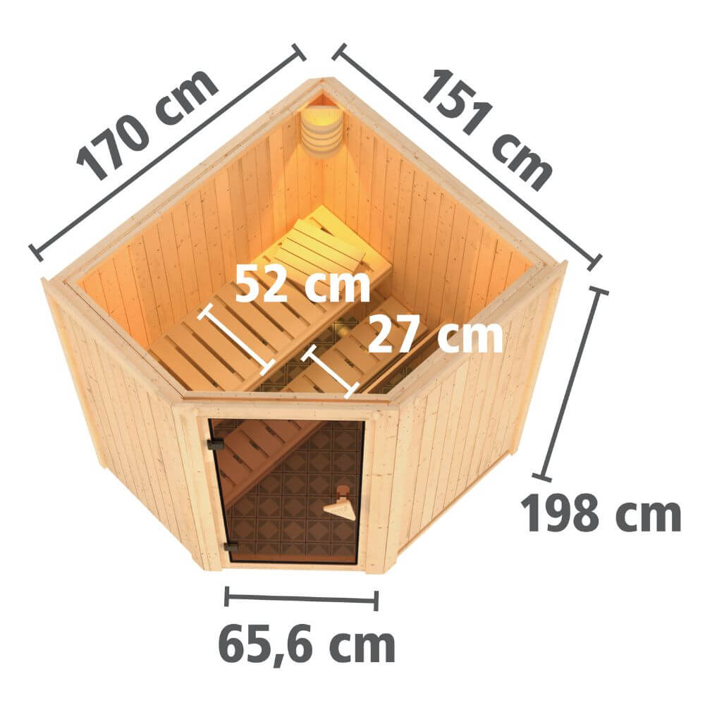 Sparen Sie wertvolle Energie mit der Systemsauna Taurin. Eine 68mm starke Konstruktion, bestehend aus einer Rahmenkonstruktion mit 42mm starker Mineraldämmwolle und einer Verkleidung an der Sichtseite aus 12,5mm Spezial-Softline-Profilholz, hält die Wärme optimal im Saunainneren. Die Decke besteht aus einer 57mm starken Spezialplatte mit Mineraldämmwolle. Die Außenmaße ohne Dachkranz betragen 170 x 151 x 198cm (B/T/H). Die Sauna verfügt über 2 Saunabänke aus Espenholz zum Entspannen und Wohlfühlen. Mit einem optional erhältlichen 4,5kW-Saunaofen bringen Sie das Innere schnell auf Temperatur. Bei dem Ofen können Sie zwischen einer Variante mit integrierter Steuerung, einer Variante mit externer Steuerung oder einem 4,5kW Bio-Kombiofen wählen. So ist garantiert für jeden das Richtige dabei. Durch einen optionalen Dachkranz inkl. drei LED-Spots können Sie Ihre Sauna von außen beleuchten und sie so perfekt in Szene setzen. In den Innenraum gelangen Sie durch eine Saunatür. Hier können Sie sich zwischen vier möglichen Varianten entscheiden. Egal ob klassisch mit bronziertem Glas, modern mit graphitfarbenem Glas, schlicht mit klarem Türglas oder passend mit einer energiesparenden, wärmegedämmten Holztür mit klarem Isolierglas. Durch die vorgefertigten Wand und Deckenelemente wird Ihnen ein einfacher Aufbau ermöglicht. Passen Sie die Sauna auf Ihre Bedürfnisse an mit unserem optional erhältlichen Zubehör. Eine ergonomische Kopfstütze für den optimalen Liegekomfort, eine ergonomische Rückenlehne zur perfekten Entspannung oder eine Saunaleuchte modern für das richtige Ambiente. Genießen Sie die Ruhe nach einem anstrengenden Arbeitstag bei einem ausgiebigen Saunagang und erholen Sie sich vom Alltag. Verringern Sie den Energieverbrauch beim Saunieren mit der 68mm Systemsauna Taurin.