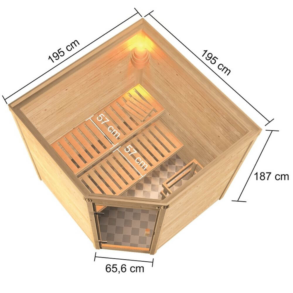Diese Massivholzsauna aus 38 mm starken Massivholzbrettern aus hochwertiger nordischer Fichte wird im einfachen Steck-/Schraubsystem errichtet. Durch die hochwertige Saunatür mit Eckeinstieg gelangen Sie nach erfolgter Montage in den Innenraum mit 185 cm x 185 cm. Hier empfangen Sie das mitgelieferte Ofenschutzgitter sowie 2 Liege/n. Auch bei unseren Massivholzsaunen im Steck-/Schraubsystem sind alle 4 Seitenwände aus massivem Fichtenholz erstellt, sodass wir hier keinen Einsatz von Hartfaserplatten oder ähnlichem haben (außer im Dachbereich). Die Sauna mit den 4 Sichtseiten können so beliebig im Raum platziert werden. Die Dachplatten bestehen aus 57 mm Elementbauweise mit einer Mineralwolldämmung.