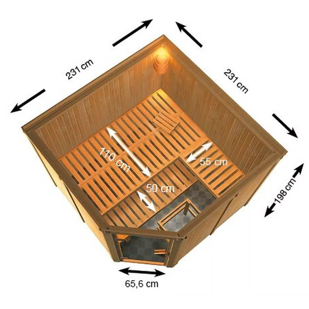 Sparen ohne Qualitätsverlust – mit der System-Sauna Ystad aus 68mm nordischem Fichtenholz.Die Sauna wird mit der einfachen Elementbauweise montiert und ermöglicht so eine schnelle Montage. Mit einem Außenmaß von 231 x 231 x 198 cm (B/T/H) bietet dieses Saunamodell ausreichend Platz zum gemeinsamen Entspannen und Wohlfühlen. Für Sitz – oder Liegemöglichkeiten in der Sauna sorgen die 3 Saunabänke aus nordischem Fichtenholz. Erweitern können Sie die Innenausstattung mit unserem optional erhältlichen Zubehör. Mit dem 3er-SET der Kopfstütze-Premium können Sie nicht nur Ihren Kopf optimal stützen. Durch zusammenschieben zweier Kopfstützen schaffen Sie sich eine Venenstütze für die Beine. Bei Problemen der Atemwege können Ihnen unsere Salzkristalle helfen. Durch anbringen einer Salzkristall-Leuchte oder einer Salzkristall Vital Sole schaffen Sie eine wertvolle, salzhaltige Luft während des Saunierens. Diese ermöglicht eine schonende und wirkungsvolle Behandlung der Atemwege und kann Entzündungen vorbeugen. Erwärmen können Sie die Luft im Saunainneren durch einen optional wählbaren 9kW-Saunaofen. Entscheiden Sie sich zwischen einem Ofen mit integrierter Steuerung, einem 9kW-Ofen mit externer Steuerung „Easy“ oder unserem Alleskönner, dem 9kW Bio-Kombiofen. Mit diesem ist neben dem normalen finnischen Saunieren auch eine Dampfsauna möglich. So können Sie die Sauna ganz leicht auf Ihre Wünsche und Bedürfnisse ausstatten. Vor Verbrennungen am heißen Saunaofen schützt Sie das, im Lieferumfang enthaltene, Ofenschutzgitter. Durch eine bronzierte Ganzglastür aus Einscheibensicherheitsglas mit Magnetverschlusstechnik wird die Saunakabine verschlossen und das Entweichen der Wärme wird verhindert. Richten Sie sich Ihre Saunalandschaft ein, mit der Massivholz-Sauna Ystad und das zu einem fairen Preis ohne Qualitätsverlust.
