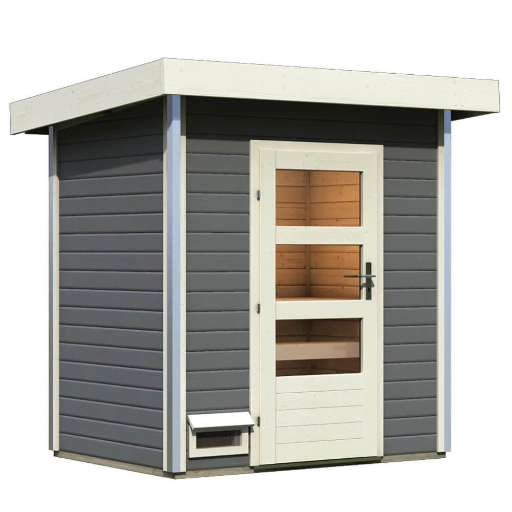 Zum Schutz des Steuergerätes vor Nässe ist ein Steuergerät-Schutzkasten im Lieferumfang enthalten. Das schützende Pultdachhaus besteht aus Massivholz und bietet, ausgestattet mit einer optional erhältlichen selbstklebenden Dachfolie, den idealen Schutz vor der Witterung. Damit die Wärme im Inneren nicht entweichen kann, wird eine zweite Decke aus einer 42mm starken Rahmenkonstruktion mit Mineraldämmwolle eingezogen. Verschlossen wird die Sauna mithilfe einer Einflügeltür mit Zylinderschloss inkl. drei Schlüsseln. Passen Sie das Saunahaus Ihrem Gartenambiente an und wählen Sie zwischen zwei Türvarianten. Die moderne Einflügeltür besitzt drei Lichtausschnitte aus Isolierglas. Diese lassen Licht in das Innere und sorgen so für eine natürliche Lichtquelle am Tag. Oder vielleicht doch lieber eine Einflügeltür mit zwei länglichen Lichtausschnitten und einem Isolierglas in Milchglasoptik für einen optisch geschlossenen Raum?Hier können Sie ganz nach Ihren Vorlieben entscheiden.