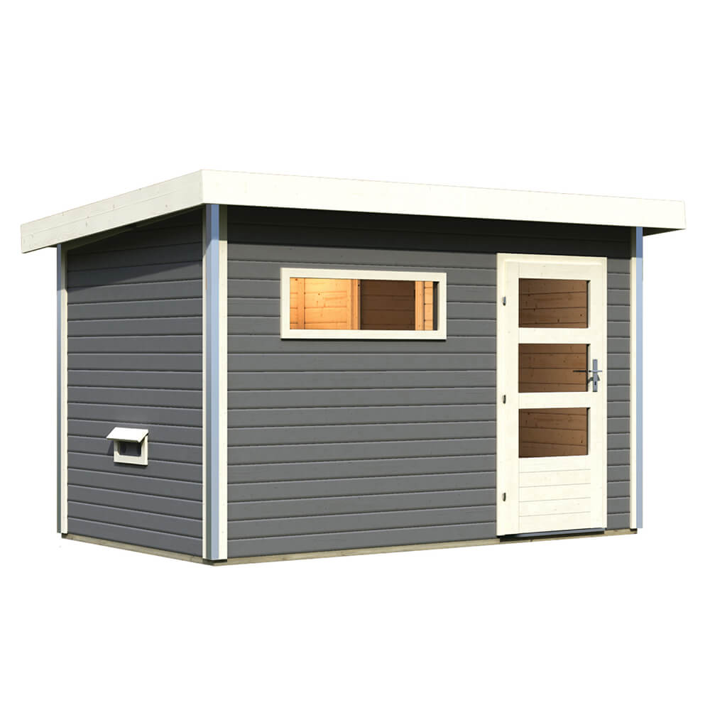 Sie möchten sich vor dem Saunieren in Ruhe in einem angrenzenden Raum entkleiden, sich nach dem Saunagang auf einem gemütlichen Stuhl entspannen oder zum Lagern der benötigten Accessoires nutzen? Diese und viele Vorteile bietet Ihnen die Außensauna Skrollan 1 mit Vorraum. Mit einem Gesamtaußenmaß von337 x 196 x 239 cm (B/H/T) schafft das Haus die nötige Fläche für eine Saunakabine zum Entspannen und einem praktischen Vorraum.