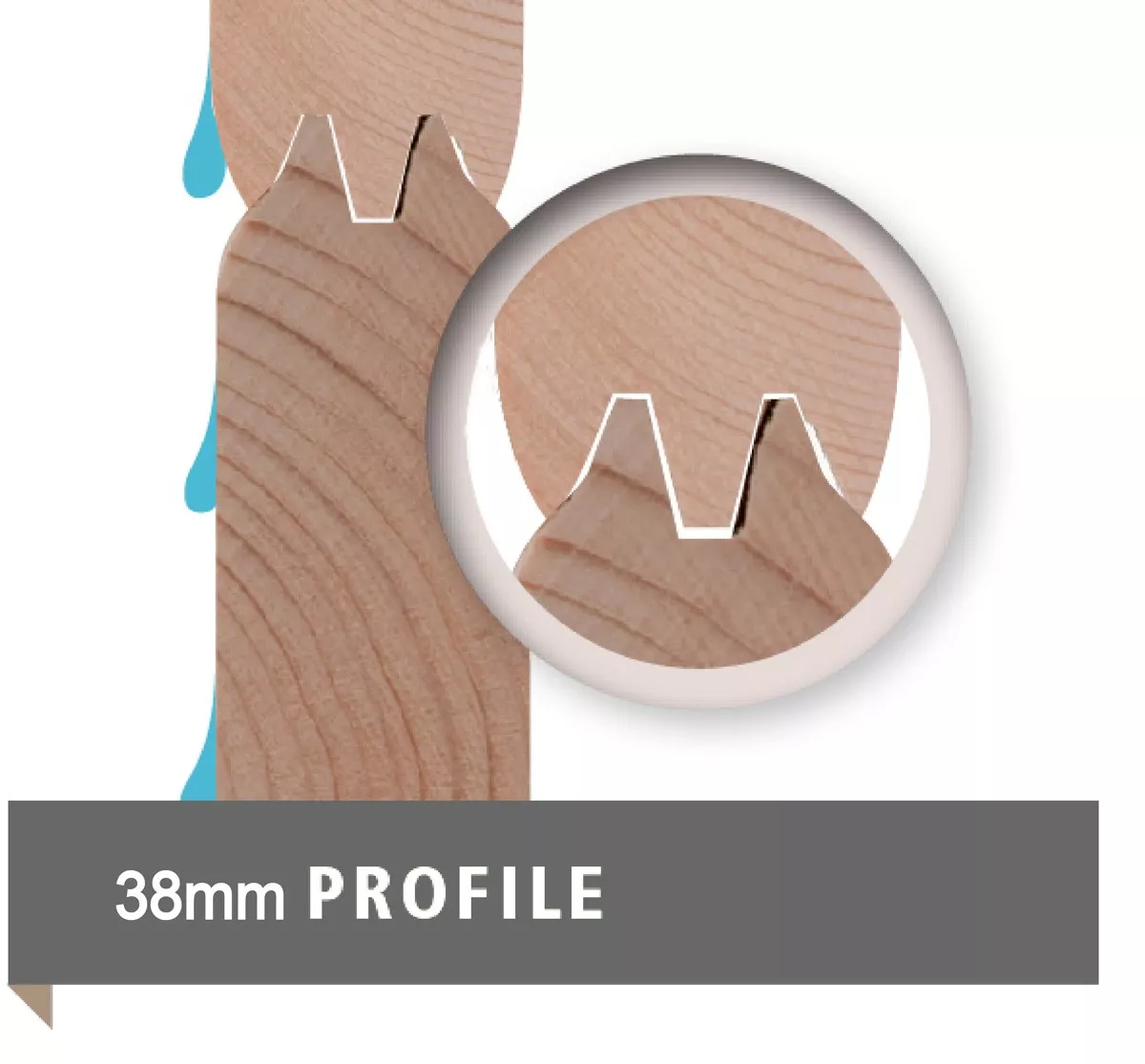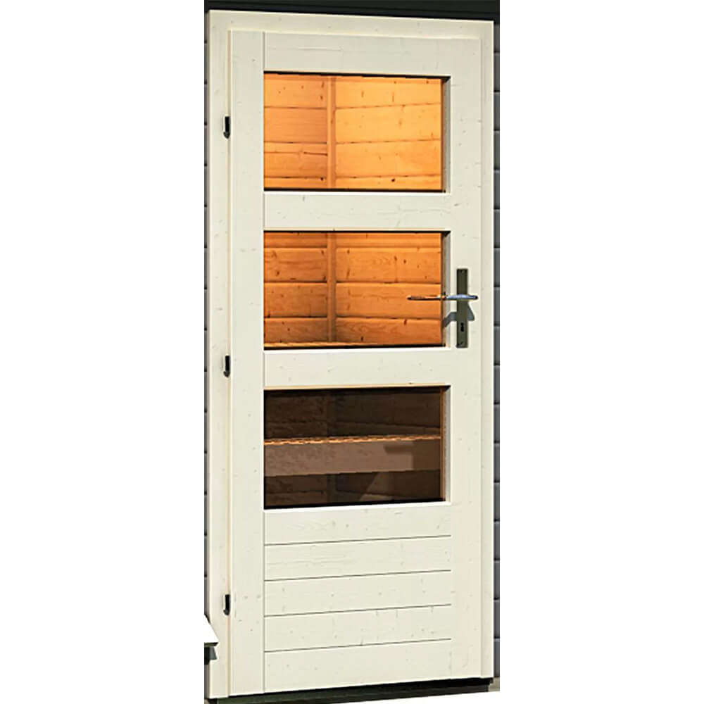 Das Dach besteht aus Massivholz und wird im Saunabereich durch eine Rahmenkonstruktion mit Mineralwolldämmung verstärkt. So kann keine Wärme aus der Saunakabine entweichen. Der Vorraum wird durch eine klassische Einflügeltür mit einem Lichtausschnitt und einem Zylinderschloss inkl. drei Schlüsseln verschlossen. Hierbei können Sie sich neben einer klassischen modernen Saunatür auch für eine Milchglastür entscheiden. Die Milchglastür hat den Vorteil, dass sie das Innere des Saunahauses auf charmante Weise verbirgt. Ein Massivholzfußboden mit einer Unterkonstruktion aus kesseldruckimprägnierten Bodenbalken schützt das Saunahaus vor aufsteigender Nässe.