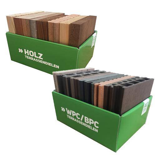 » erhältlich sind 2 Boxen mit aktuellen Terrassendielen in WPC & BPC und Holz» insgesamt 16 Muster (8x Holz, 8x WPC & BPC)