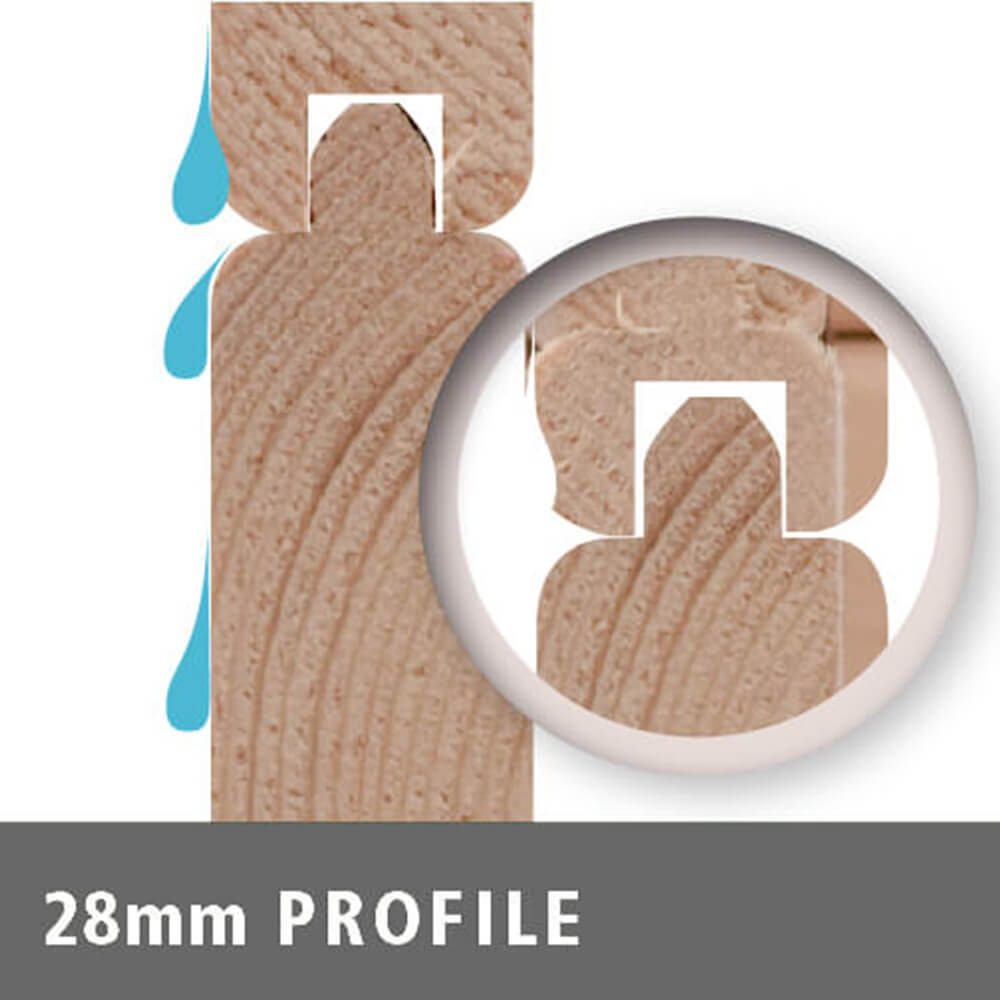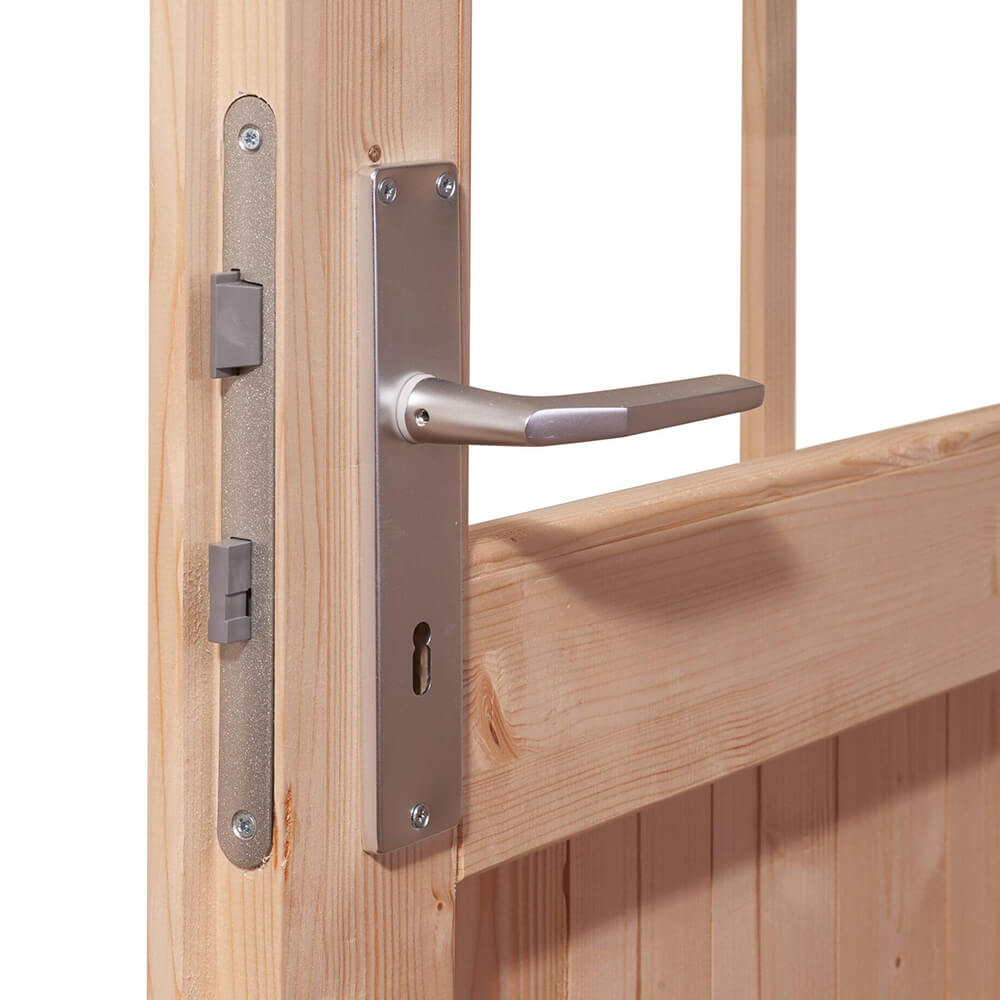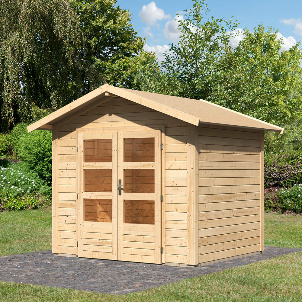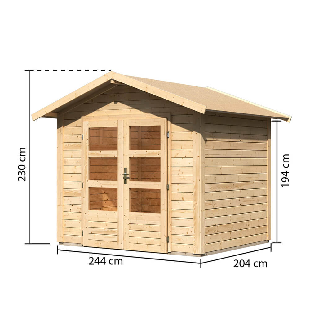 28 mm Wandstärke, Doppeltür, Steck- Schraubsystem, Firsthöhe 230 cm, Nadelholz naturbelassen.